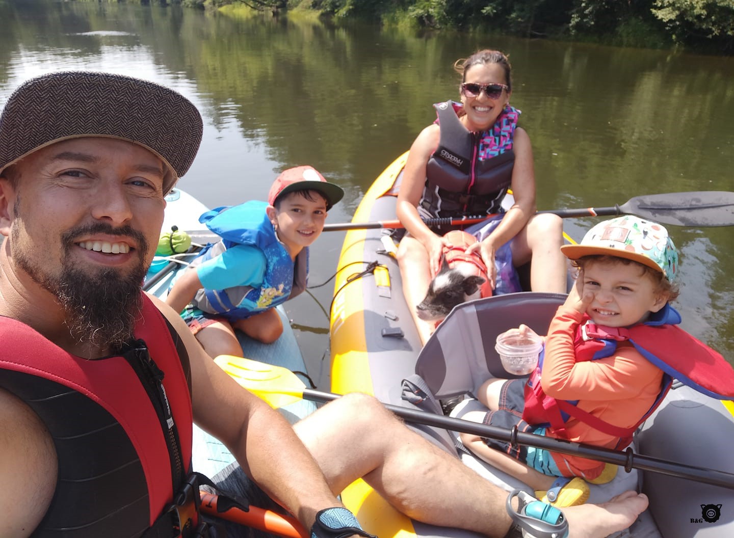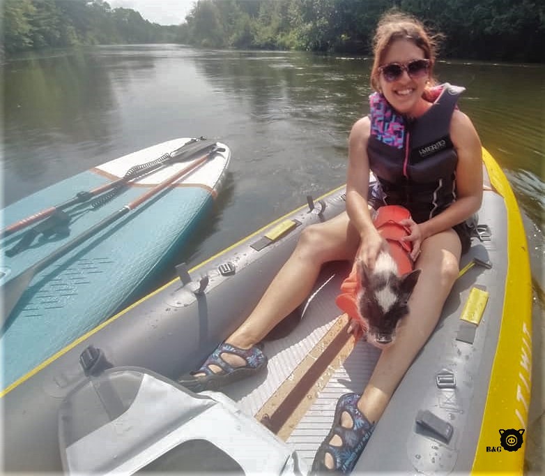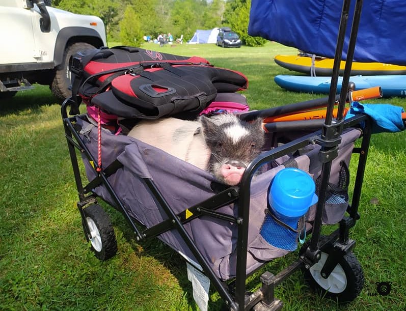 Enfin, pause de voiture aujourd’hui! Les garçons et moi, on est plutôt contents. Et Jérémie aussi car hier, la conduite a été sportive! Moi qui m’attendait à une petite journée tranquille à brouter, ma famille a eu l’idée la plus saugrenue qui soit : m’amener en kayak! Non mais a-t-on déjà vu ça un cochon en embarcation?!? Ils avaient prévu le coup en plus et m’avaient trouvé une ceinture de sauvetage à ma taille. Aie aie aie!!! Pas moyen de m’en sauver… Vous savez quoi? J’ai survécu!!! Bon, je ne vous dis pas que ça va devenir mon activité préférée, mais à la fin de la balade, j’étais assez à l’aise pour me promener à bord. Et j’étais tellement content de retrouver le plancher des vaches que j’ai même accepté de marcher jusqu’à notre terrain avec ma laisse. Ça, ce n’était pas arrivé souvent avant!