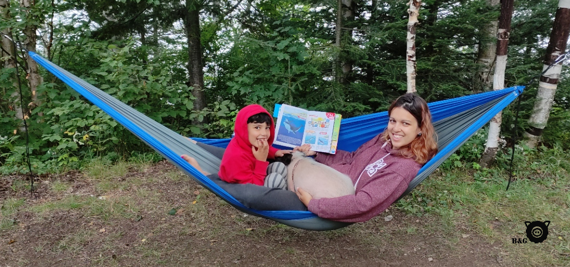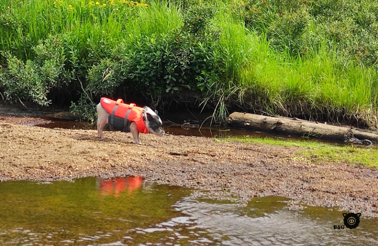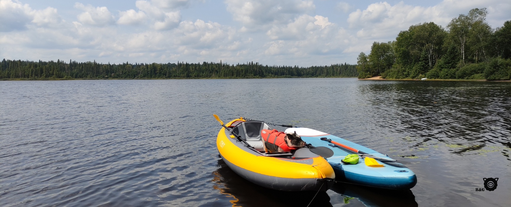 Dernière petite balade en kayak (et oui, encore!) en avant-midi pour finir d’explorer le lac et s’aventurer aux abords de la rivière Matawin, qui donne son nom à cette belle réserve. Tous s’amusent à jouer les aventuriers, même moi! En faisant de petites escales sur les berges asséchées, nous découvrons de petits trésors cachés. Le décor est magnifique et nous étirons tous un peu le temps, question de savourer encore ces quelques moments loin de tout. La météo est clémente et, pour en profiter, mes humains finissent l’excursion à l’eau! Imaginez vous la scène: un cochon comme seul maître à bord pour ramener un kayak et une planche à bon port! Remarquez que j’aimais tout de même mieux rester au sec que de devoir nager comme eux!