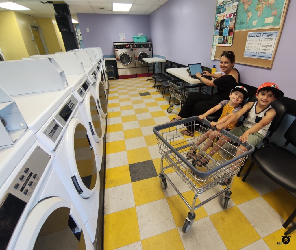 Avant de reprendre la route, nous commençons toutefois par une petite virée à la buanderie, qui est définitivement une expérience en soi! On ramasse un petit déjeuner d’une pâtisserie tout prêt. On mange tout le monde sur un banc pendant que notre lavage sèche. Et dès que c’est fini, « Edmonton, here we come! »