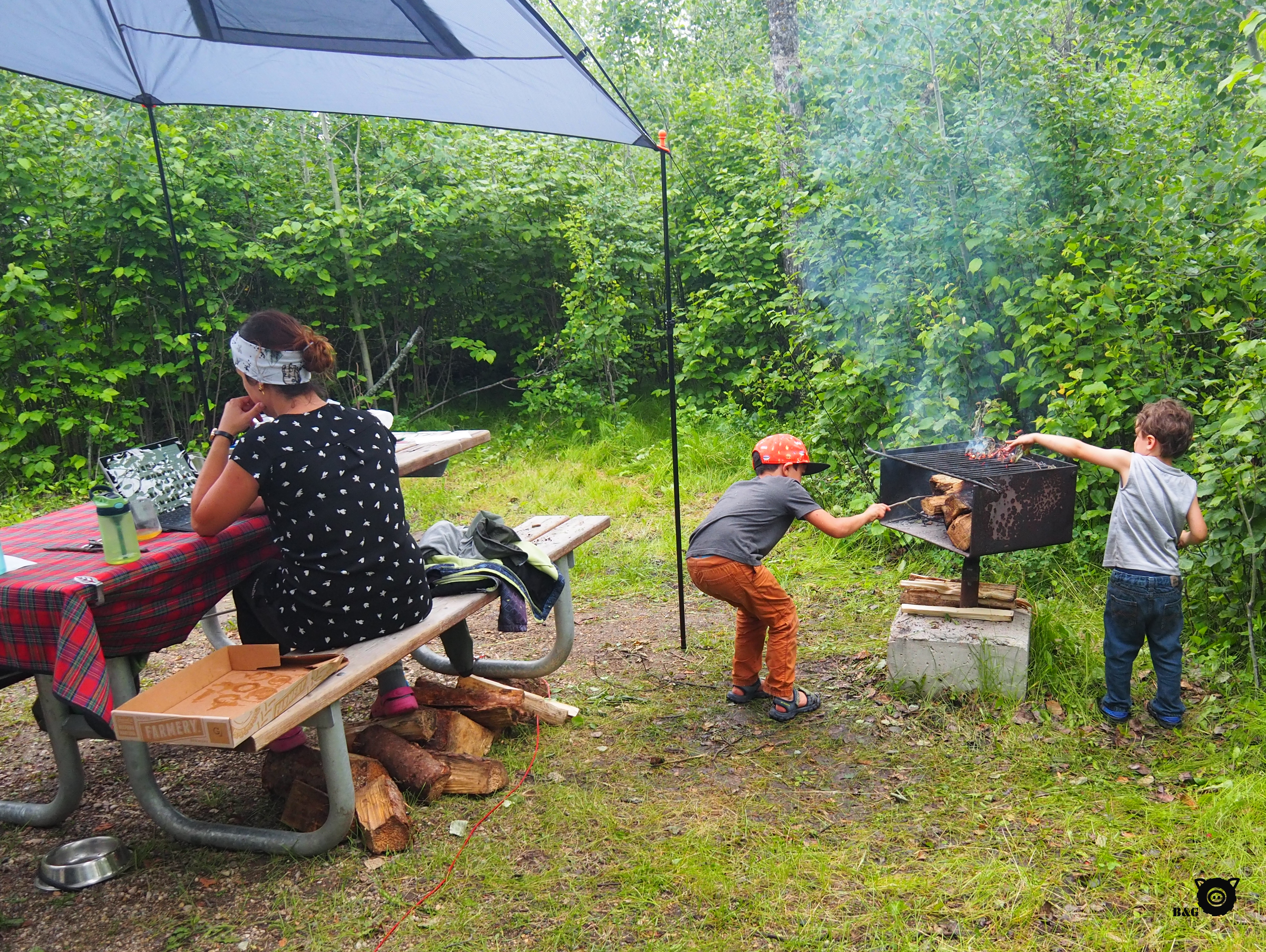 Nous campons pour la soirée au Parc National du Mont-Riding (on n’a pas trouvé le mont encore), où malheureusement on profite peu des installations car il y a plusieurs averses tout au long de notre séjour. Ça semble tout de même très mignon, avec une plage pas très loin du camping et des petites boutiques en tous genres. Au lieu de ça, les enfants s’inventent des fours à pizza en faisant griller des feuilles d’arbres sur le feu et Papa répare notre échelle brisée avec les moyens du bord. Je lui ai d’ailleurs prêté mon dremmel de manucure qu’il a transformé en grinder, en drill, en tout ce que vous voudrez pour mener à bien son projet. Je vous dis, il peut vraiment se débrouiller avec n’importe quoi! Pas très longtemps après notre départ le lendemain matin, nous franchissons une nouvelle étape du voyage : la Saskatchewan! Toutes les caractéristiques des Prairies y sont réunies : les grands champs à perte de vue, les longues routes droites vers l’horizon, les vaches brunes dans les champs, les tracteurs gigantesques, les silos de grain au bord des chemins de fer, les trains interminables, et les accents sympathiques mais difficiles un peu à comprendre pour les touristes. 😉 Et pendant que nous sommes occupés à admirer les beaux paysages sur les routes peu pavées du nord de la province, où on croise principalement des gros camions, on se fait rappeler à l’ordre subitement par un solide caillou qui décide de terminer sa route en plein centre du pare-brise. BANG! Un éclat gros comme un 25 cent dans le milieu du champ de vision. Papa a lancé un gros mot, les garçons se sont mis à répéter ledit gros mot, moi j’ai grogné et Maman a fait des gros yeux. Heureusement, Papa avait prévu aller visiter un garage de LandRover lors de notre passage à Calgary, alors on va en profiter pour leur demander s’ils ont de quoi réparer ça. À suivre…