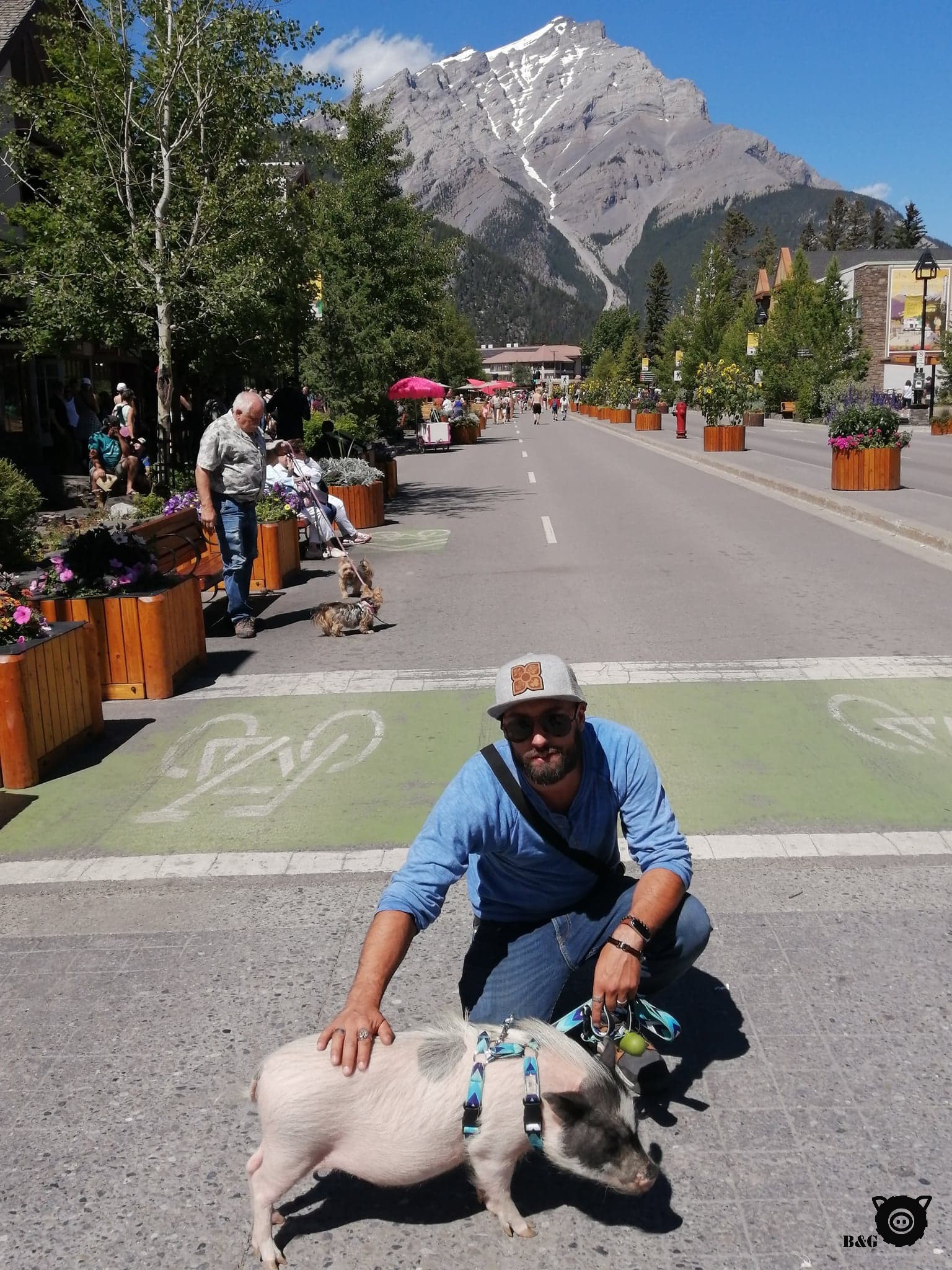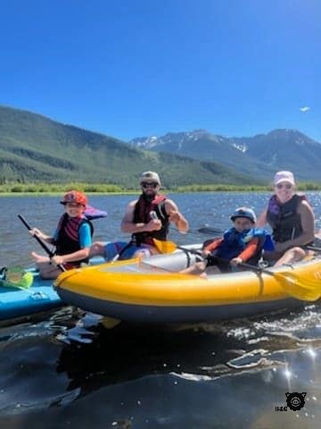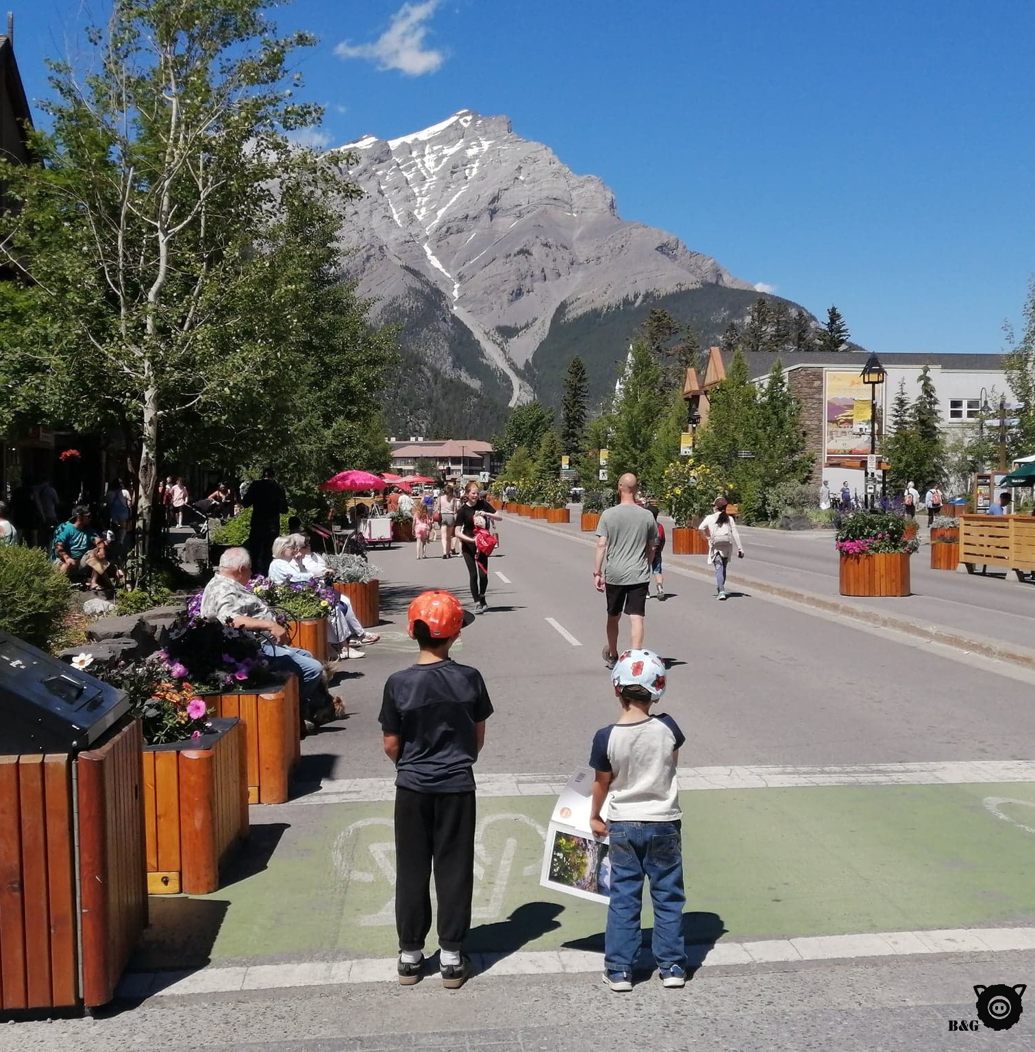 Ensuite, petit tour de Banff où on retrouve une collègue de Maman et son amoureux, également en vacances dans l’Ouest pour l’été. On s’assoit pour placoter autour d’une bonne pizza (malheureusement, il n’y en a pas pour moi, mais la terrasse est « pet friendly » et j’ai droit à un bol d’eau fraîche et plusieurs bonnes miettes) et ensuite, on va avec eux faire une belle promenade de paddle/kayak sur l’un des Lacs Vermilion, juste à l’entrée de Banff. Le soleil est bon et le maillot est bienvenu, en contraste avec notre matin tout emmitouflé! Les humains font leur balade au milieu des montagnes pendant que je me remets de ma marche en ville. On se sert ensuite dans nos bras en se souhaitant à chacun une belle poursuite de voyage et en espérant peut-être se recroiser au fil de la route.