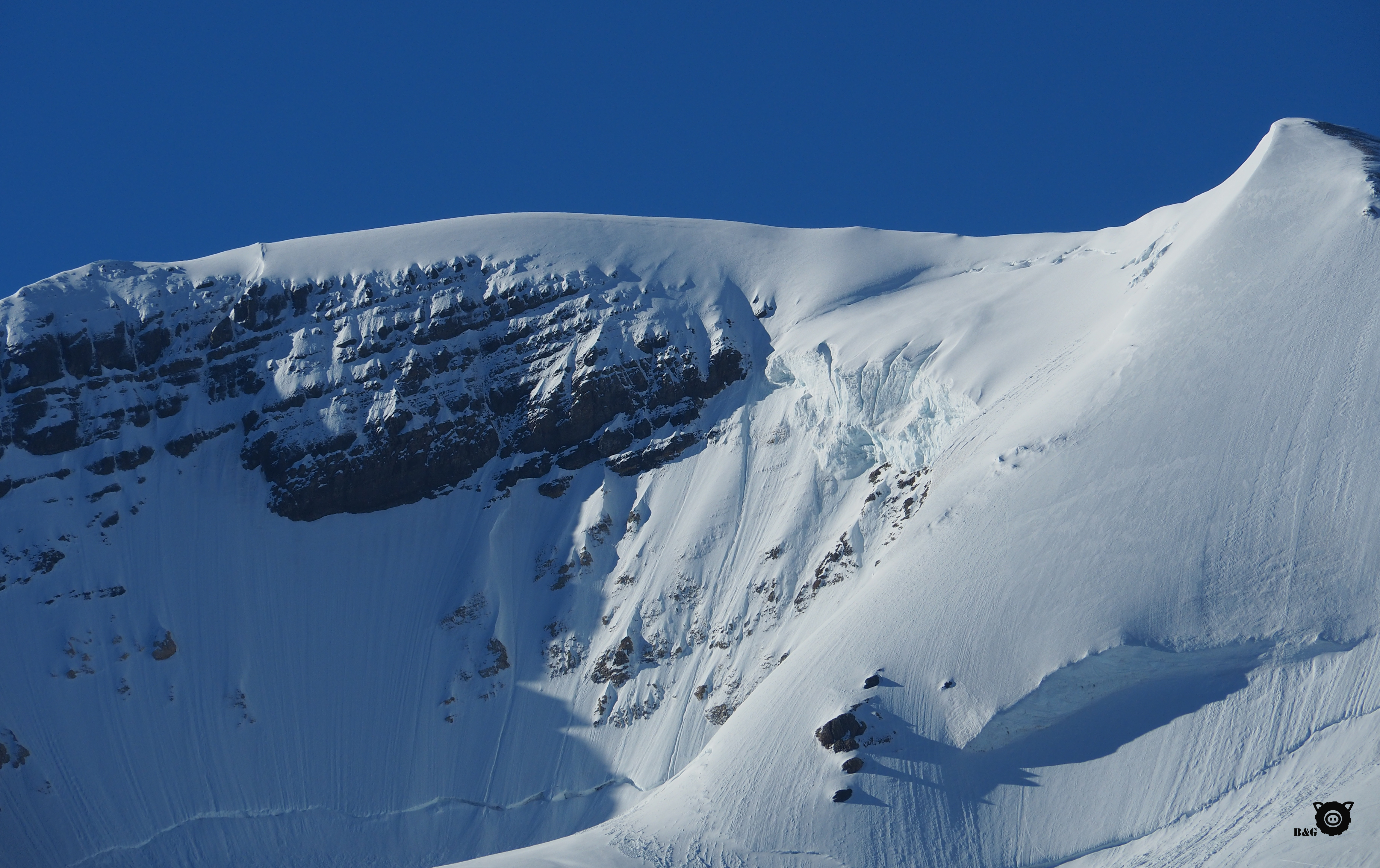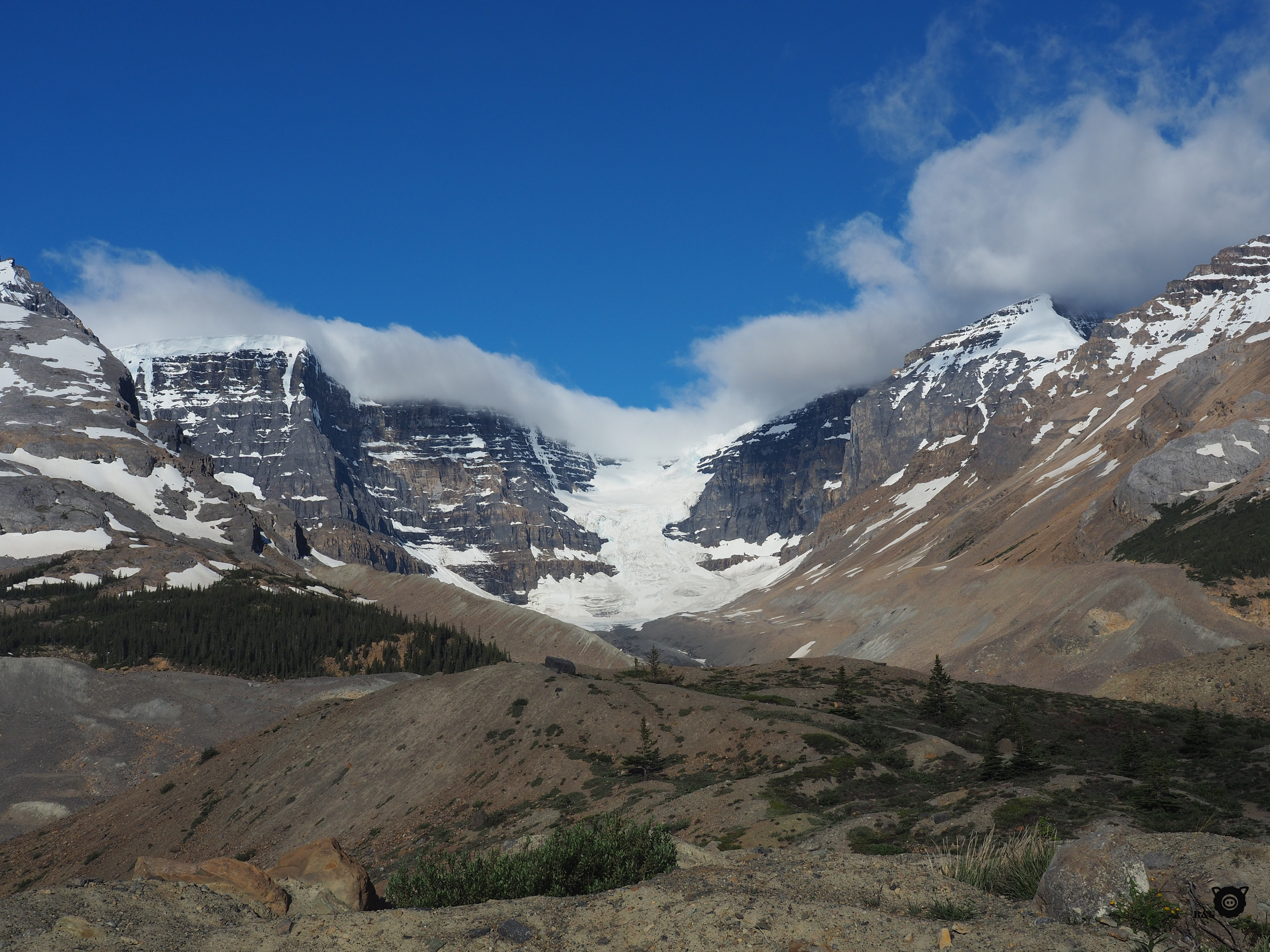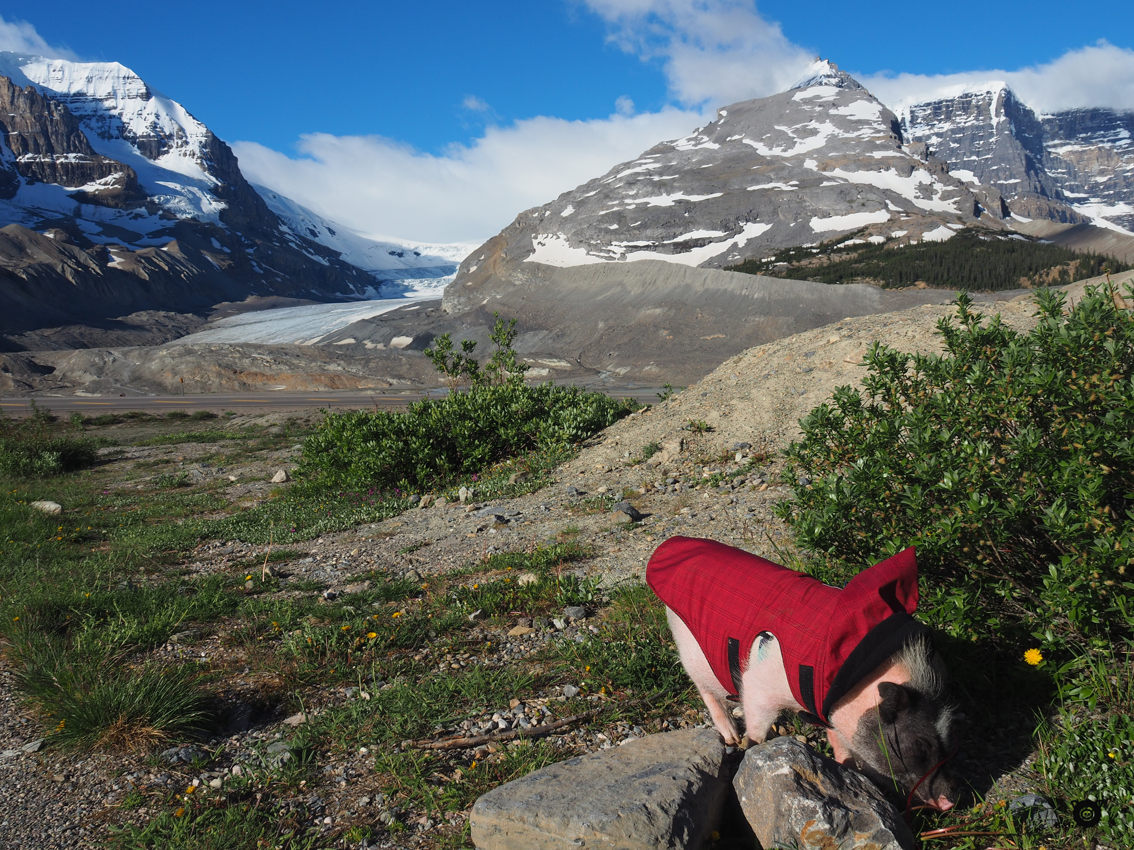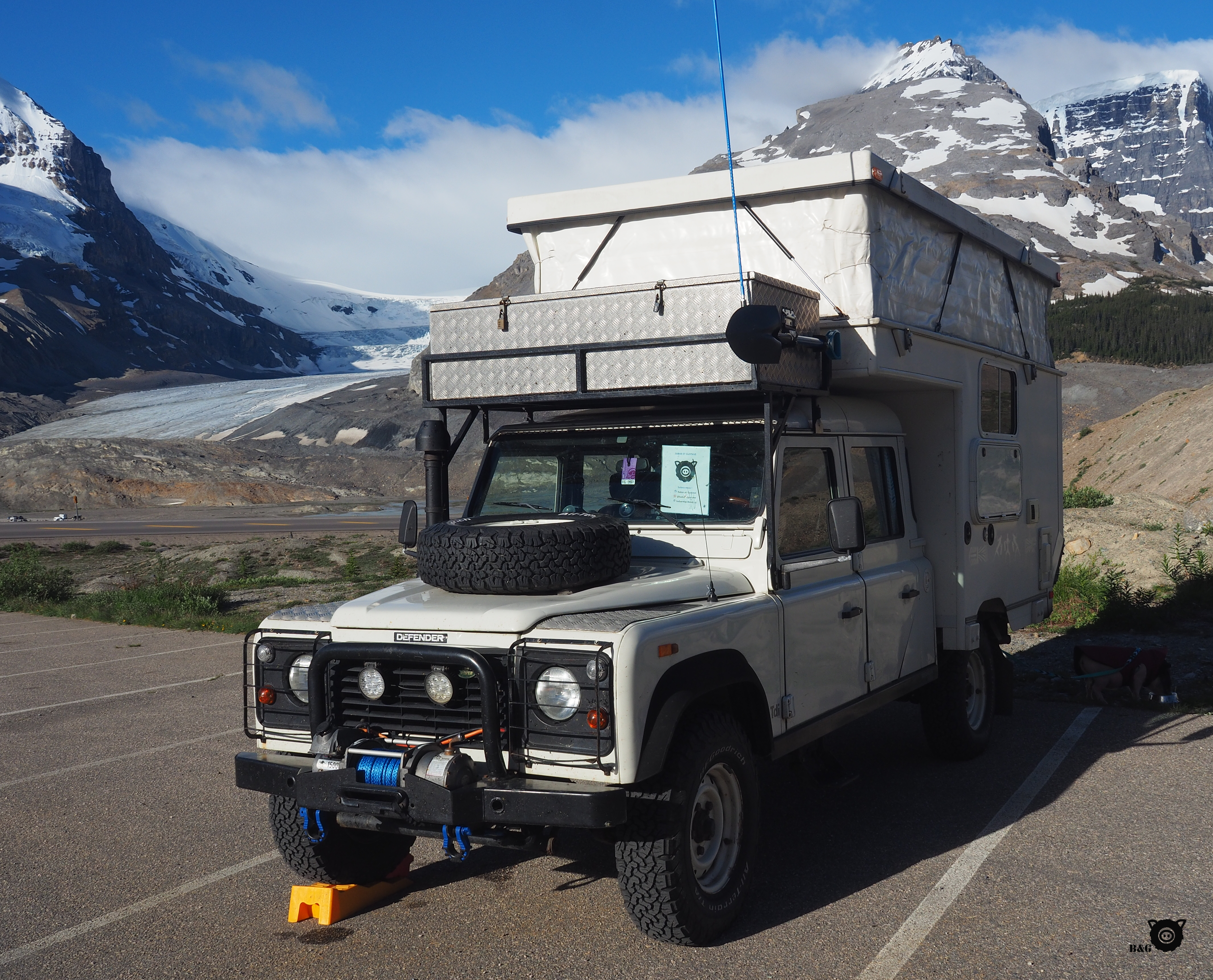 Après avoir profité d’un petit matin avec nos amis, nous quittons vers l’heure du dîner pour reprendre le chemin des vacances. On croise encore quelques ours et chèvres de montagne sur la route. On fait un petit arrêt à Jasper pour se dégourdir les pattes, mais nous serons de retour dans quelques jours pour visiter davantage. Nous nous arrêtons pour la nuit dans ce qui sera je crois bien le plus impressionnant décor de dodo de tout le voyage: le Icefield RV campground (qui est en fait un grand stationnement), juste au pied du Glacier Athabaska dans le Columbia Icefield. C’est majestueux!!! Pour les intéressés par les détails, c’est un camping officiel du Parc National, sur le principe de premier arrivé-premier servi (il y a vraiment beaucoup de place, donc pas trop d’inquiétude pour ça). Et on paie dans une enveloppe ou par carte de crédit. Le prix est peu dispendieux et il y a des toilettes sèches, mais pas d’autre service. Il fait « frette » (je ne m’ennuyais pas de l’hiver moi, surtout pas en plein mois de juillet!!!) et c’est très venteux, mais si vous avez du chauffage (heureusement Babar en a pour me réchauffer un peu) ou des bonnes couvertures, l’expérience est assez fantastique. À notre réveil, il y a même un soleil radieux pour illuminer tout ça. On ne pouvait pas rêver d’une plus belle vue!!!