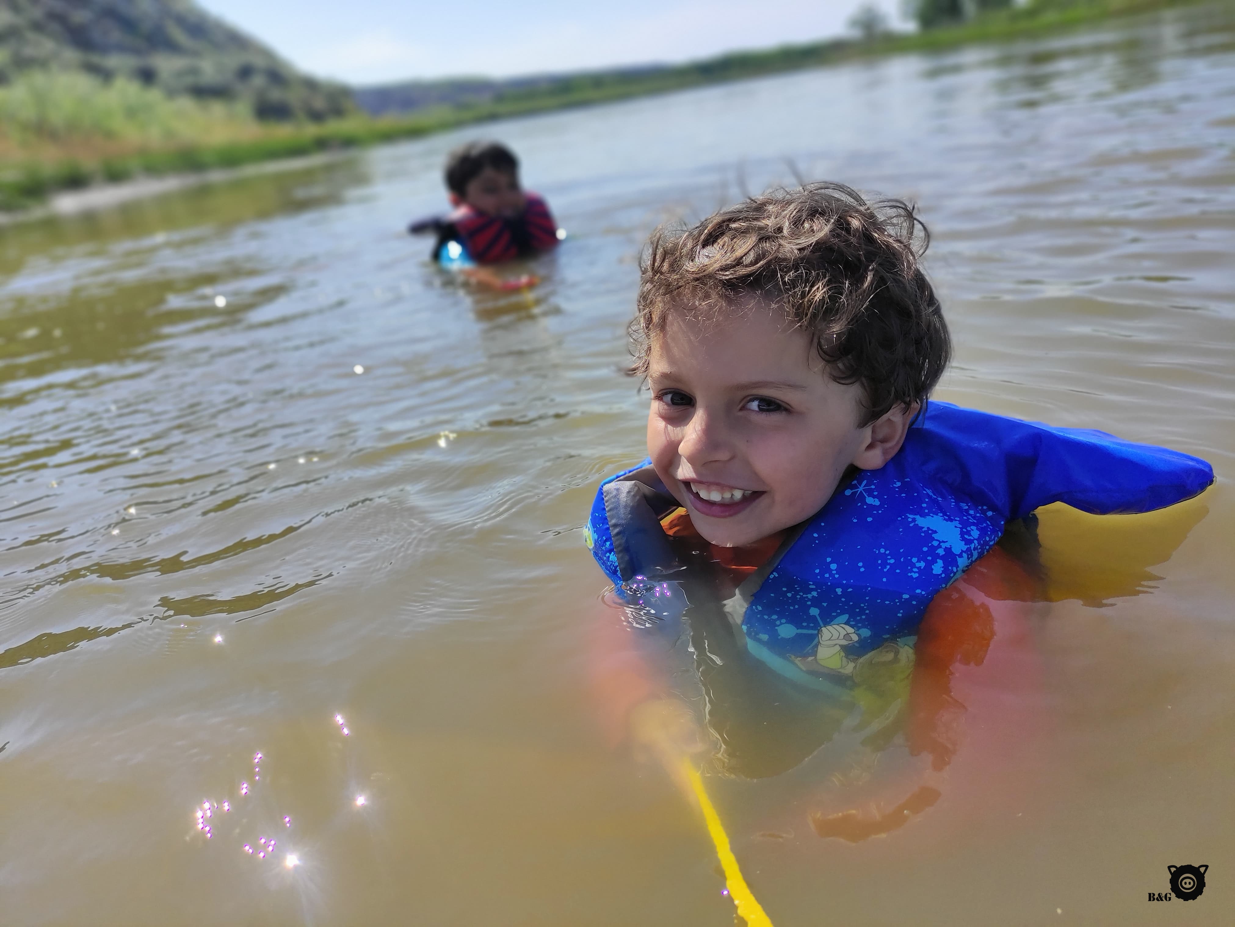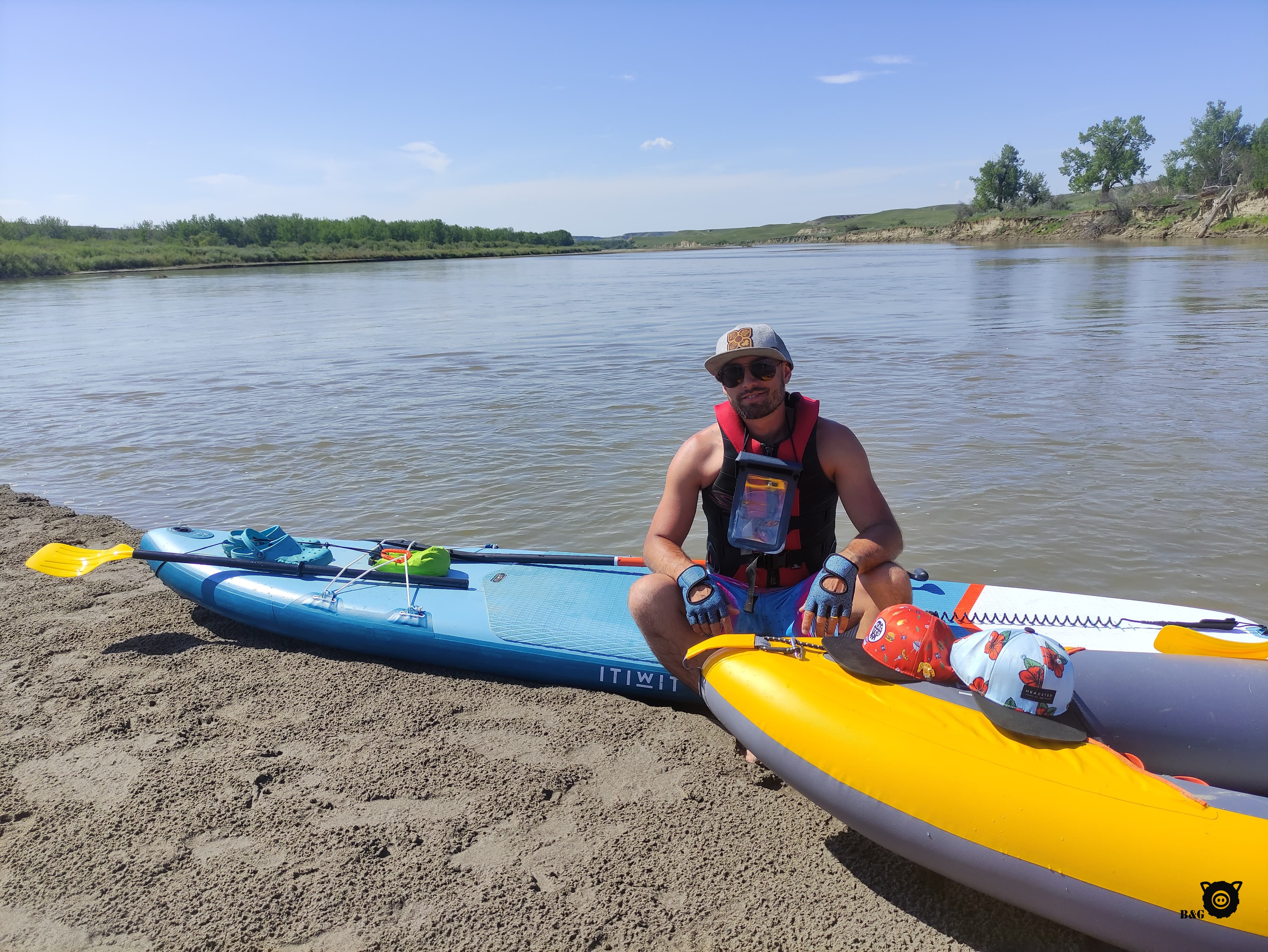 On se dirige ensuite au Dinosaur Provincial Park, environ 1h30 plus au sud, où plusieurs fossiles vus hier au musée ont été trouvés. Des fouilles sont d’ailleurs toujours en cours à cet endroit. On peut y admirer des fossiles aux endroits précis où ils ont été trouvés, et marcher dans le parc en s’imaginant très bien être au pays des dinosaures. En après-midi, nous partons tous les 5 sur l’eau en planche et kayak, sur la Red Deer River qui traverse la vallée. Les garçons s’amusent à dériver dans le courant et tout le monde peut se rafraichir un peu. Nous nous installons ensuite au camping pour la soirée, parmi une variété inconnue mais vorace de nouveaux maringouins. Décidément, ils sont partout, même au beau milieu des cactus! Et pour terminer la soirée, nous assistons au spectacle du parc, à thématique dinosaure bien sûr!