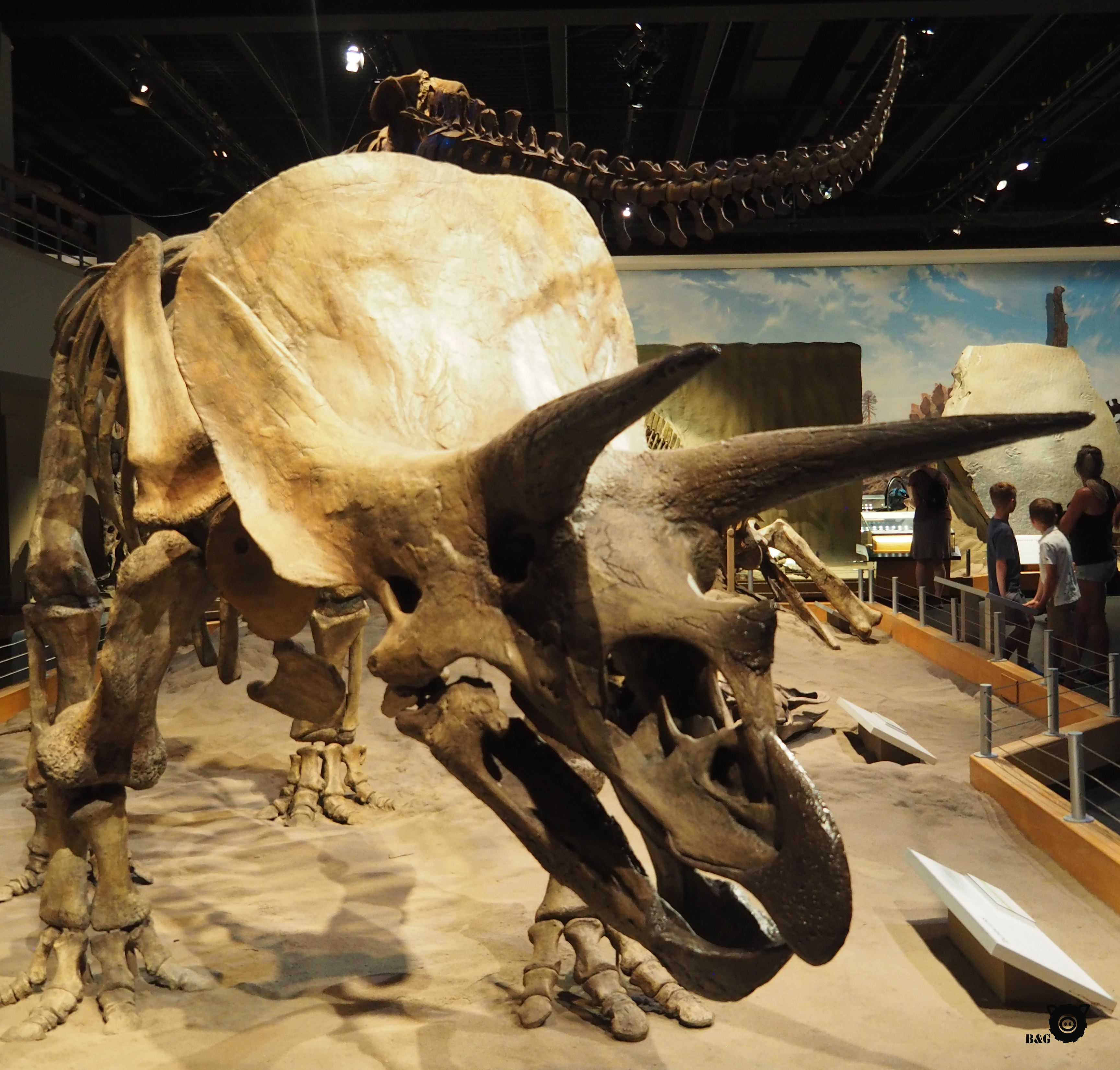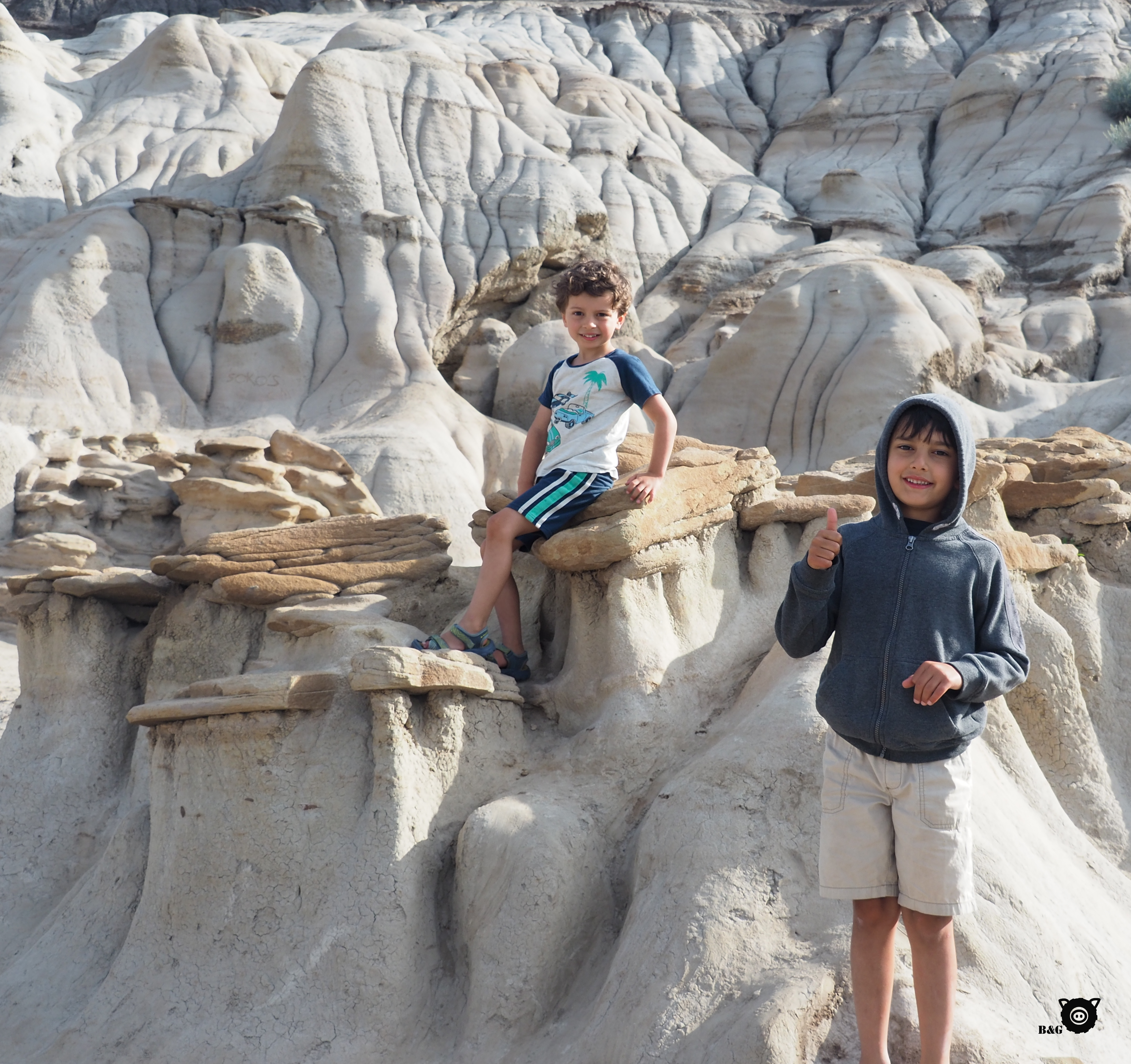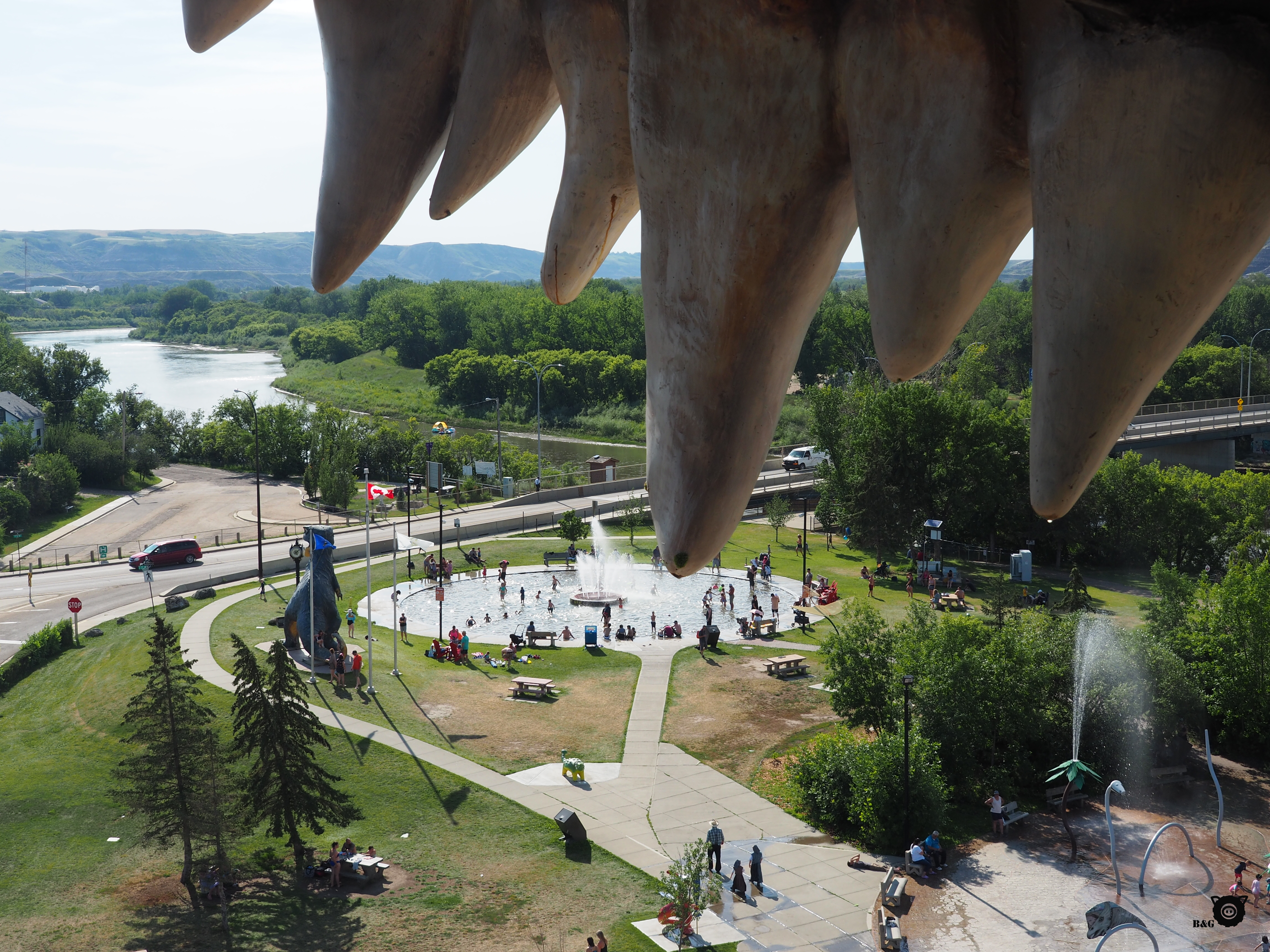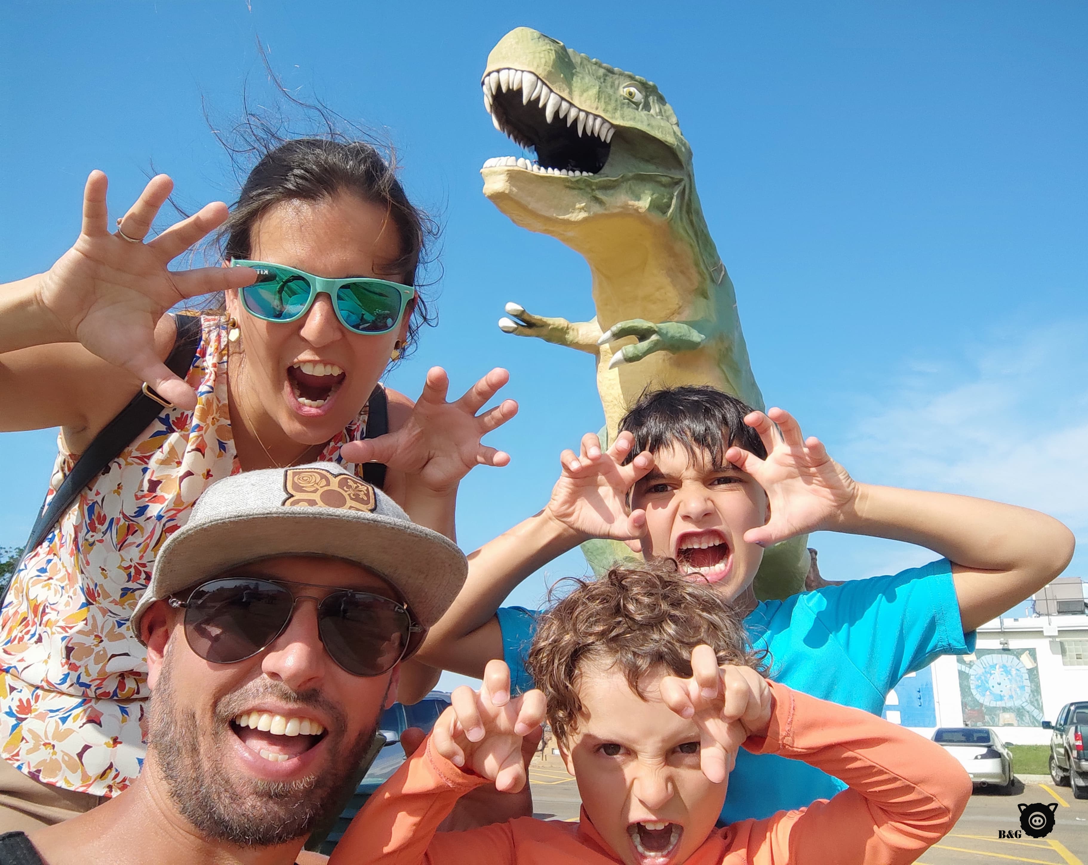 Pour les deux prochains jours, nous changeons de décor complètement et allons nous imprégner du monde des dinosaures! Après un petit arrêt magasinage à Calgary en avant-midi, nous débutons notre escapade au Royal Tyrell Museum de Drumheller pour d’abord en apprendre plus sur ces grosses bêtes et sur les fossiles. Musée super intéressant, à l’air climatisé, fait notable en cette autre journée cuisante au coeur des Badlands. Nous allons ensuite nous rafraichir dans la barboteuse de la ville, questions de se redonner un peu d’énergie, avant de grimper dans l’antre du plus gros dinosaure au monde! Les garçons avaient bien envie d’aller voir le point de vue entre ses grosses dents, alors je les attends pendant qu’ils montent la volée de marches au coeur du dino pour aller admirer les alentours. Papa nous cuisine ensuite un petit souper au bord de la plage municipale, parce que nous courons vraiment les points d’eau en cette vague de chaleur. Pour le dodo, nous nous installons pas très loin, sans doute au spot dodo le plus impressionnant que nous ayons fait après le glacier Athabasca, au pied de la Hoodoo trail, seuls au monde dans ce paysage désertique. Tout un autre coup d’oeil!
