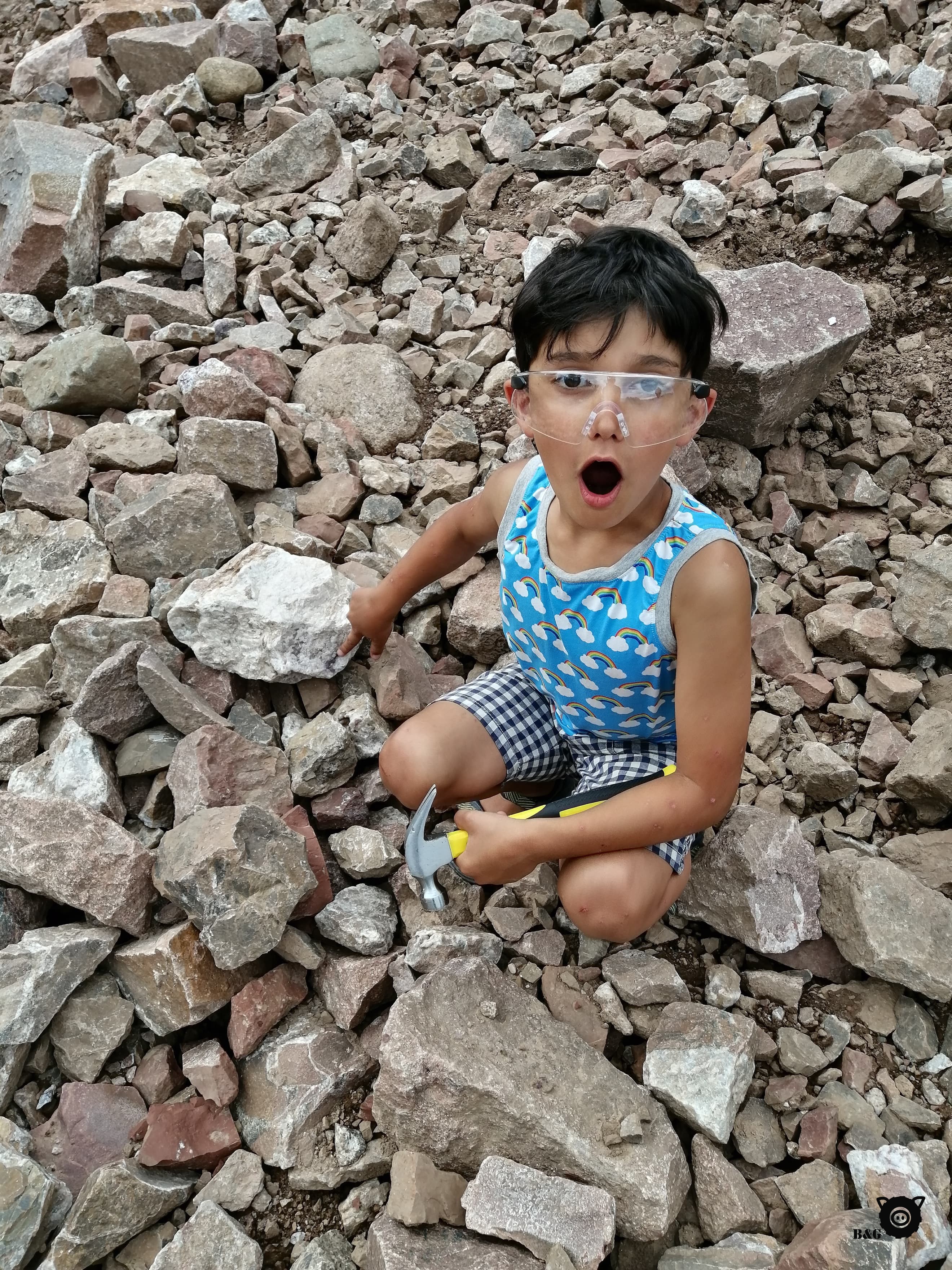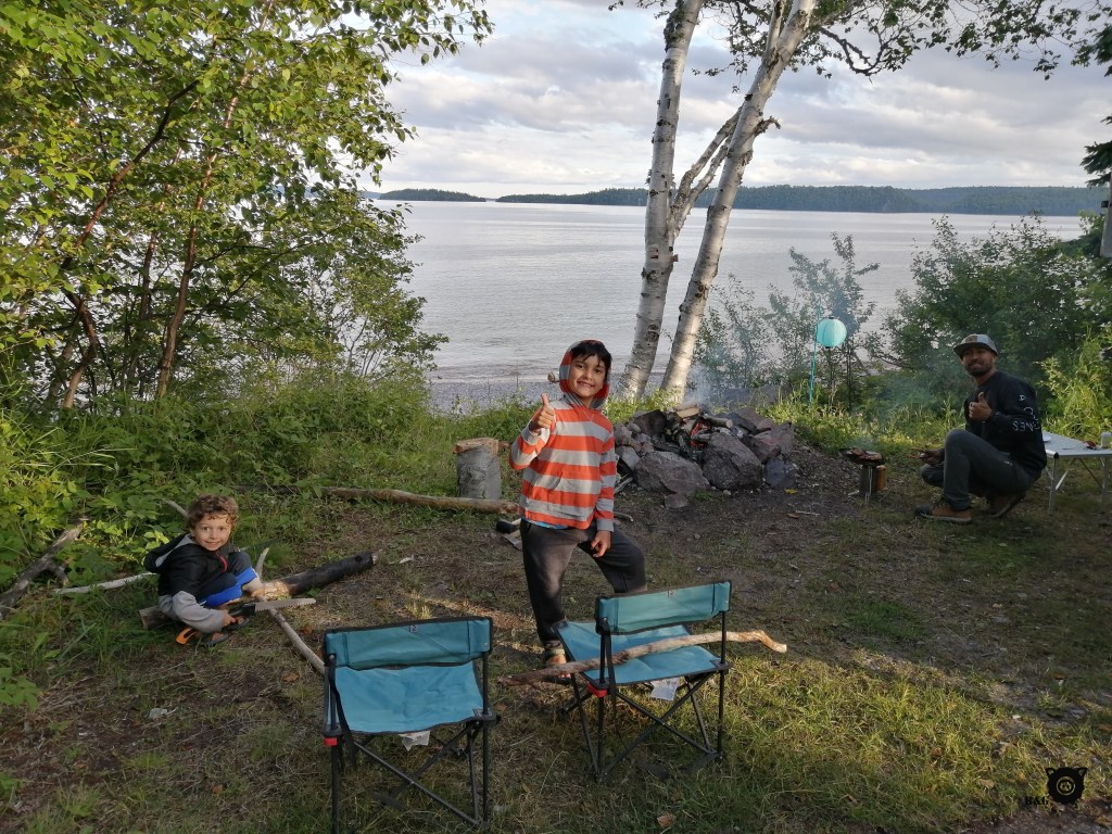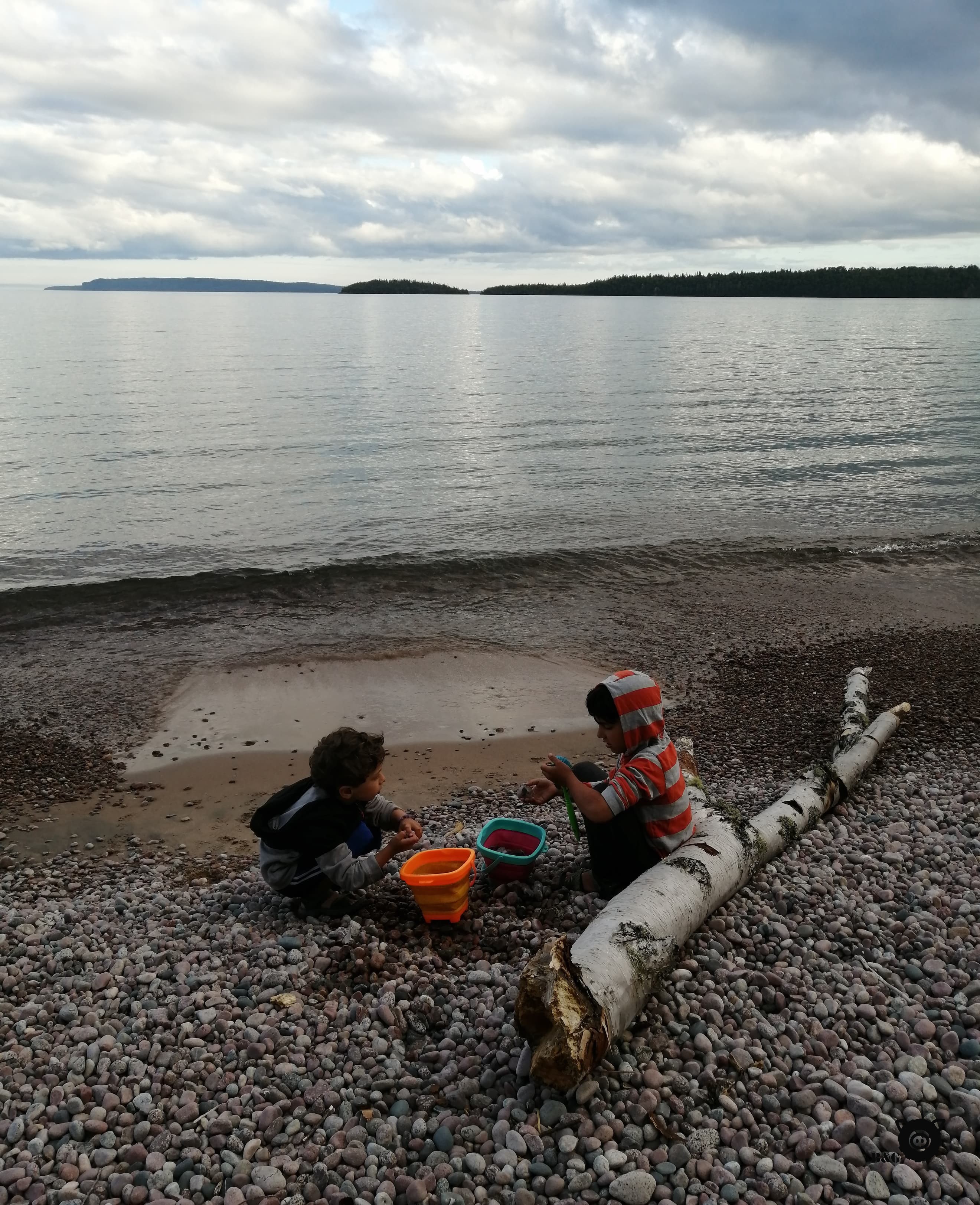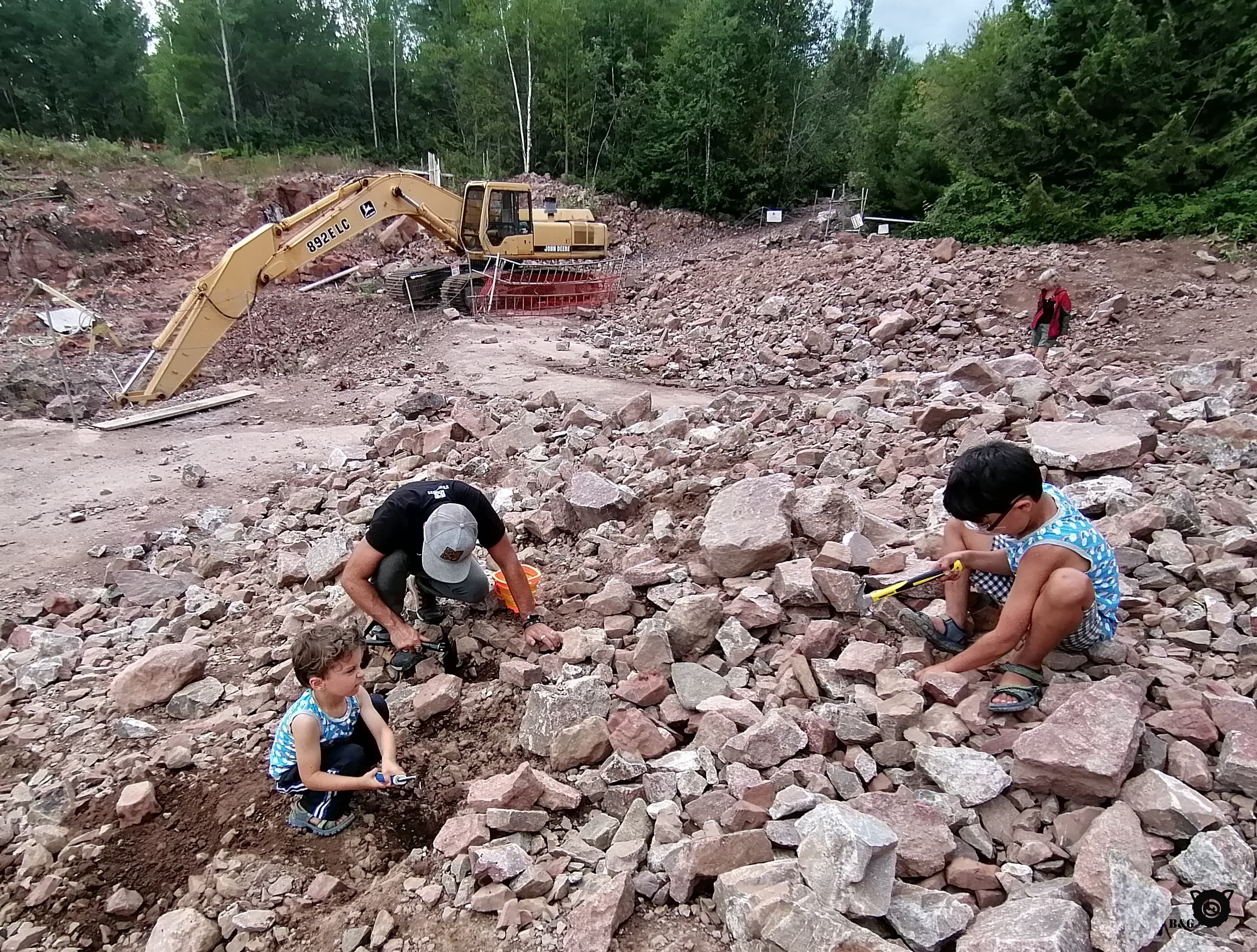 Dernier droit avant la maison! Notre objectif ce matin est de se rendre à Thunder Bay et d’arriver à temps pour aller visiter une mine d’améthystes. On arrive une heure avant la fermeture, mais on réussit! Comme on est un peu pressés et que je ne marche pas vite, je laisse mes humains y aller sans moi. Mais vous auriez dû voir les yeux des garçons lorsqu’on leur a annoncé l’activité : aller creuser avec des pelles et des marteaux (déjà, c’est dans leurs cordes)… pour trouver des pierres précieuses!! Le sourire lorsqu’ils ont trouvé leur première roche mauve et brillante…! Alors après une belle heure de creusage et de cassage de pierre, ils sont revenus avec une bonne récolte de ces magnifiques roches, qu’on rapporte bien entendu avec nous. On poursuit juste un peu plus loin pour s’installer pour la nuit dans un endroit magnifique, à nouveau sur les rives du Lac Supérieur. On savoure tous les 5 cette douce et belle soirée au bord de l’eau en lavant nos roches et en ramassant des tonnes de bleuets sauvages. Miam!