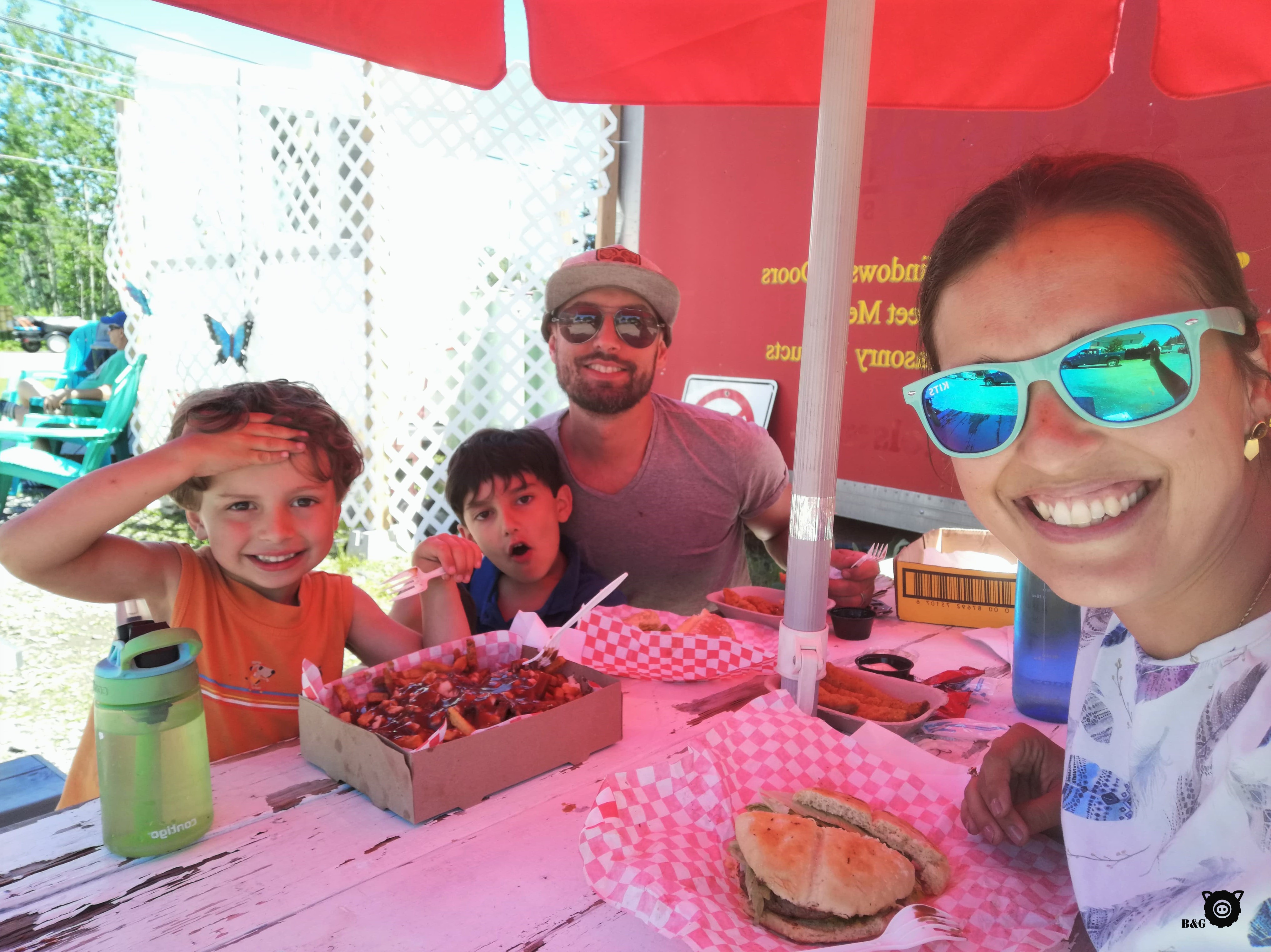 On repart rapidement le matin suivant et on va se préparer un bon petit déjeuner à la halte routière d’Elliot Lake (;)) Re-route aujourd’hui, car on veux s’approcher le plus possible de chez Papi et Nat, pour profiter de l’après-midi avec eux demain. On se paie la traite pour le diner dans l’un des typiques « chip stands» de l’Ontario au bord de la route (on n’avait sérieusement jamais vu une aussi grosse poutine!!). En fin de journée, on s’arrête pour faire une petite épicerie à Petawawa avant de s’arrêter pour la nuit et… plus de servodirection! Alors on reste un peu plus longtemps que prévu : Papa cherche la source du problème, Maman cherche les alentours pour trouver du liquide à servodirection, et les garçons tentent d’aider comme ils peuvent. Un gentil monsieur mécano s’arrête pour venir voir si on a besoin d’aide et conclut avec un autre ami mécano que la meilleure solution est probablement de continuer à rouler vers la maison, sans servodirection (avec « power bras » dirait Papa), et de changer tout ça une fois rendus. Alors on change un peu nos plans de ce soir d’aller dormir dans le bois sur les terres de la couronne, et on file plutôt vers chez Papi, question d’être en ville et pas trop loin si jamais Babar devait devenir plus mal en point. On arrive juste à temps pour le dodo, une bonne douche et une finalement belle et longue jasette de personnes heureuses de se retrouver.