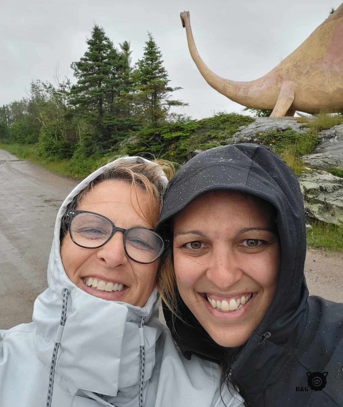 Le sympathique Quai de Ragueneau: quelques dinosaures sont au rendez-vous pour divertir les enfants sur la route! (dodo possible aussi sur le quai pour les voyageurs). Bon, vous remarquerez que nous avons courageusement bravé la tempête pour avoir les photos en preuve à l’appui!!!! (ne me cherchez pas, on ne m’aurait JAMAIS convaincu de sortir par un temps pareil)