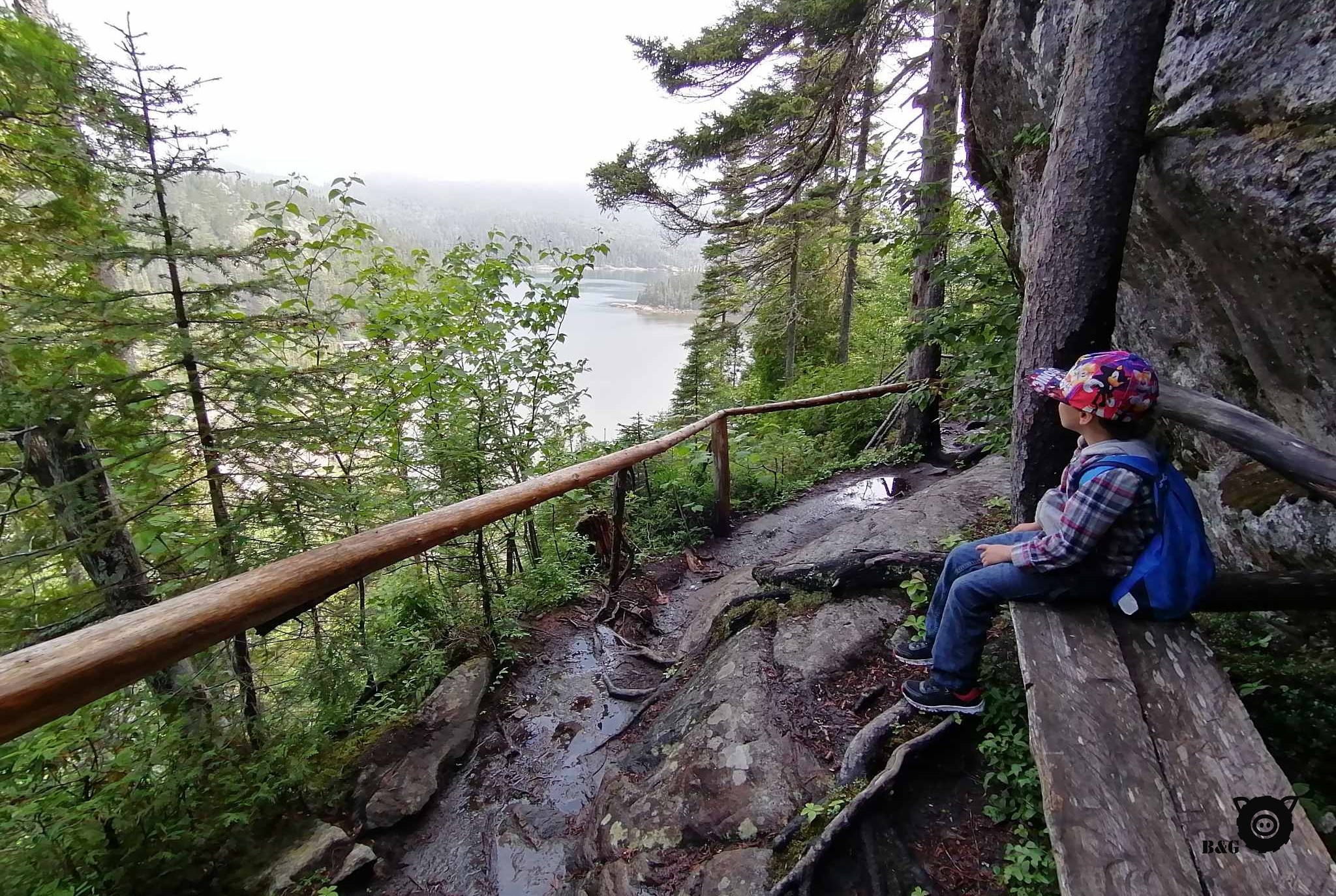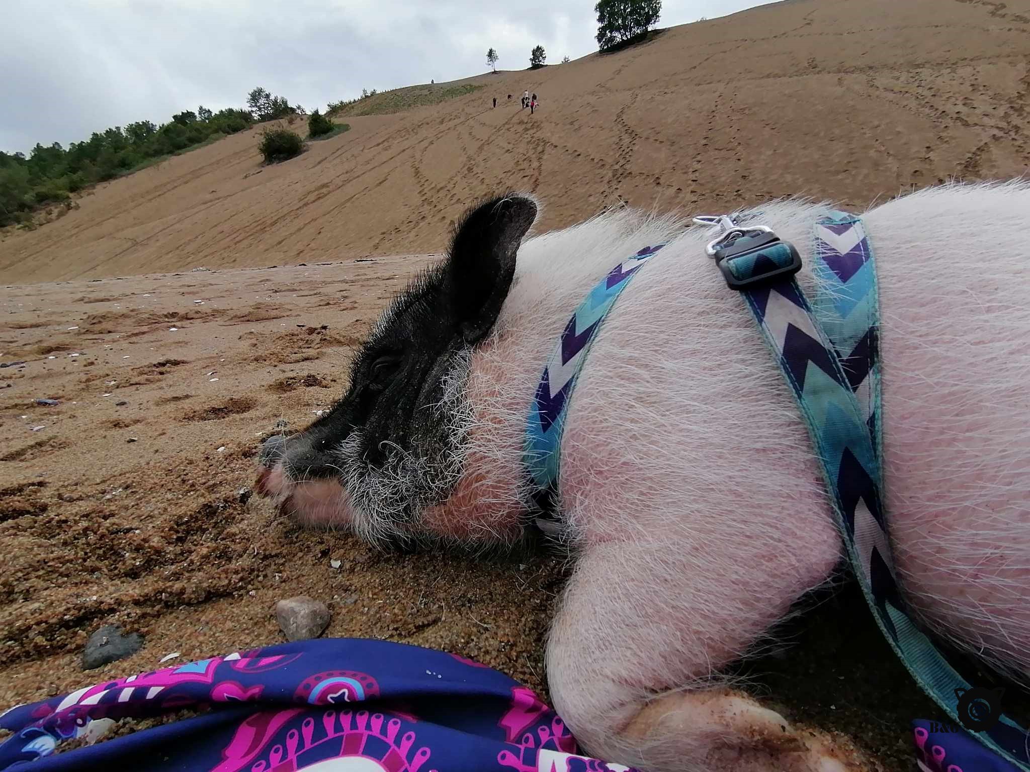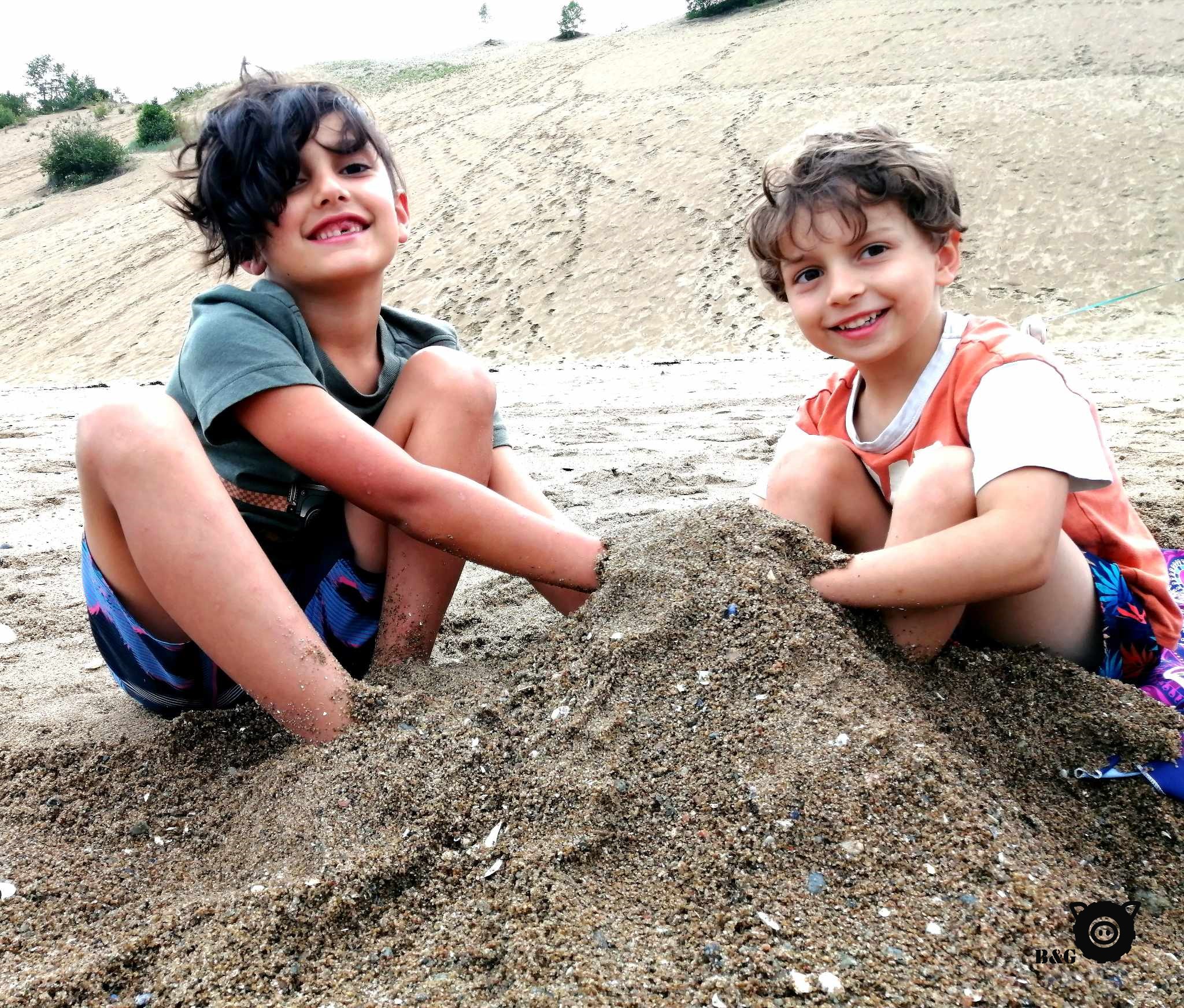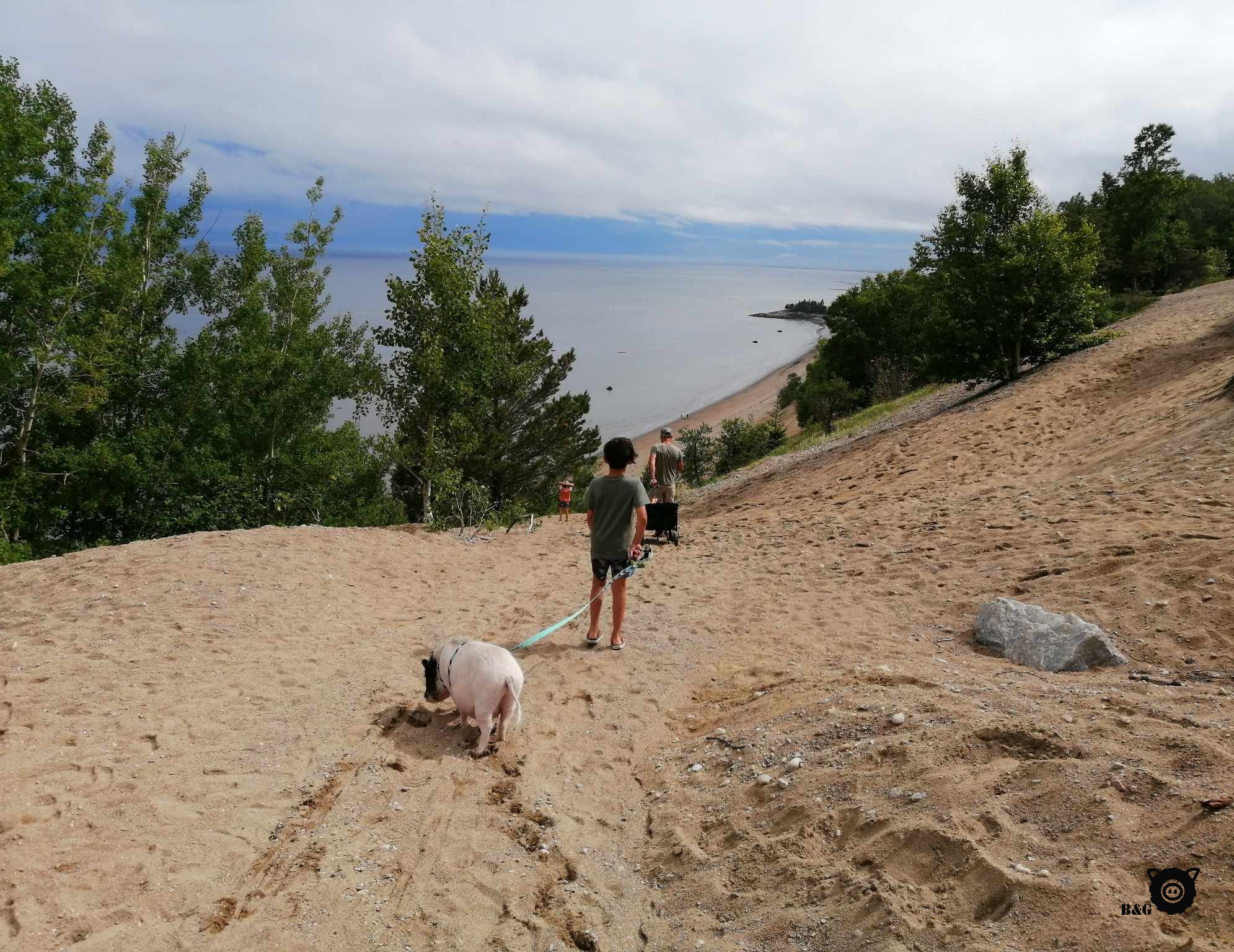 On repart ce matin, après des gros câlins et des « à bientôt » à nos amies de la Côte-Nord. On va déposer Mamie chez ses amies d’école à Longue-Rive, mais comme il ne fait pas un temps à mettre un cochon dehors, on décide pour notre part de continuer un peu la route à la recherche de soleil. Et c’est aux Grandes Bergeronnes qu’on le trouve! On s’arrête pour pique-niquer avec vue sur le fleuve, au soleil, une petite brise par-dessus le marché, le paradis quoi! Ensuite, escale aux Dunes de Tadoussac pour profiter de la plage. Quelle belle découverte! Vous auriez dû me voir. Un vrai cochon des sables! Et une collation d’algues fraîches tout en bas pour me récompenser de mes exploits. Car c’en était tout un quand même, vous demanderez à Papa! Et comme on n’était pas tout à fait rassasiés de notre dernière visite, nous sommes retourné camper à Baie-des-Rochers, avec dans l’idée de partir à la découverte de la petite plage sauvage tant vantée par les locaux la fin de semaine dernière… Alors on se met en route pour la randonnée mercredi matin (« on » excluant moi, qui préfère faire la sieste pour me remettre de mon aventure des Dunes!). Après un deux heures de randonnée plutôt sauvage (affectueusement surnommé « parcours de ninja » par les garçons!!!), eux aussi ont trouvé leur récompense : la fameuse Anse-aux-Sables! Un petit coin de paradis quasi désert de l’autre côté de la montagne. Je dis « quasi », car sur le chemin du retour, ça ressemblait davantage à une autoroute de randonneurs! Mais tout de même une très belle randonnée à faire sans cochon et avec de bons souliers.