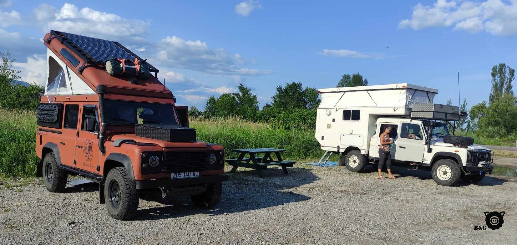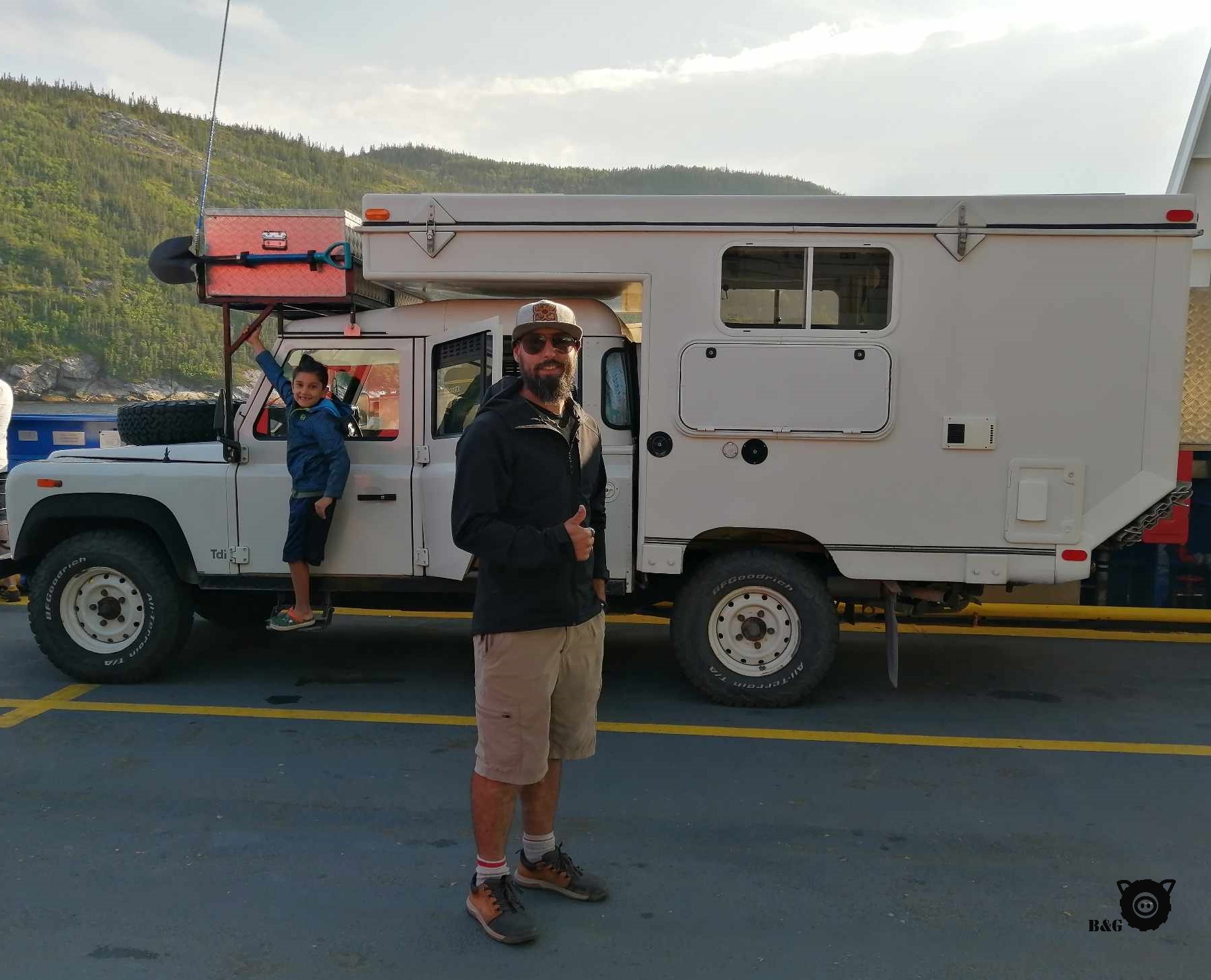 Ensuite petit lunch vide-frigo avant de repartir faire quelques commissions épicuriennes à Baie-St-Paul et s’arrêter pour un dernier dodo à Petite-Rivière-St-François. Il y a un stationnement aménagé par la municipalité pour les campeurs de passage comme nous, tout près du quai. L’endroit est parfait et Babar s’y fait même un nouvel ami, un autre Defender qui parcourt les Amériques avec sa petite famille. Marche sur la plage au coucher de soleil, petit défoulement dans le parc pour les garçons et même un spectacle d’Opéra sur le quai pour terminer cette belle journée.