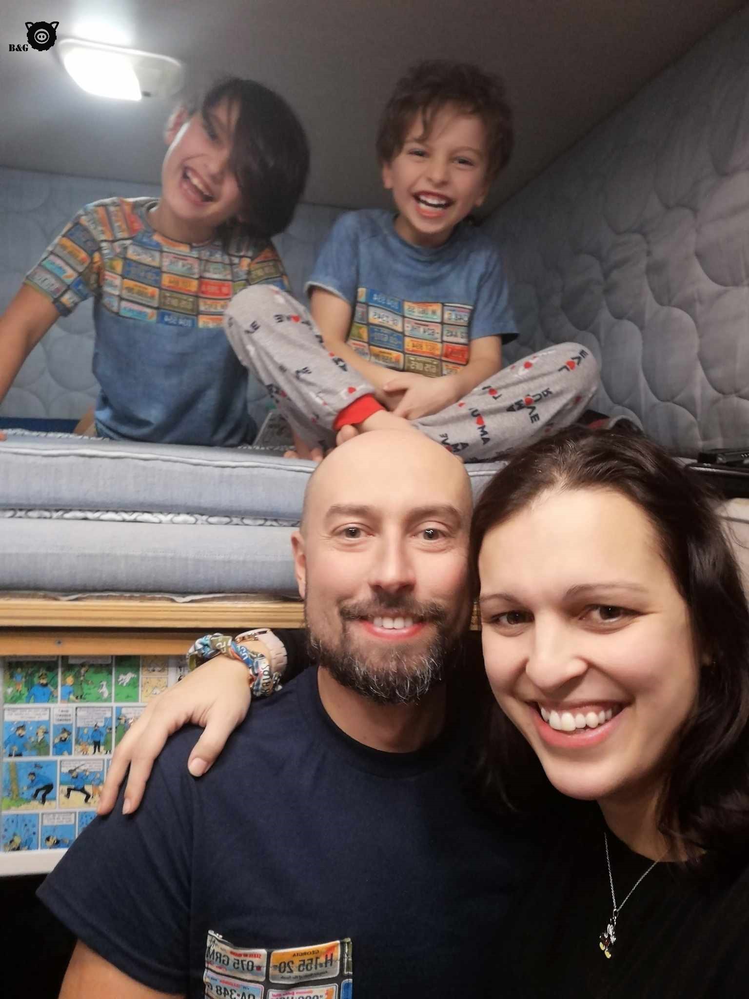 C’est donc en ce 8 janvier 2024, qu’après avoir tout embarqué, nettoyé, patenté, amélioré pendant plusieurs jours durant, que c’est enfin le jour J. Le jour du grand départ. Le jour où on ne retournera pas à l’école ou au travail. Le jour que notre famille attend depuis si longtemps, mais qui finalement, est arrivé beaucoup plus rapidement qu’on l’aurait imaginé. Le jour qui nous rends tous très excités, stressés, inquiets, émerveillés. C’est bien celui-là. Le jour où je deviendrai la maison de notre petite famille pour les 5, presque 6, mois à venir. J’ai beau être un gros éléphant blanc, je reste une toute petite maison pour mes habitants. J’ai déjà accompagné deux autres familles dans le passé, vous savez. Qui elles aussi avaient le goût de l’aventure. Fidèle compagnon de Maman, Papa, Elliot et Gaël depuis maintenant près de 3 ans, une fois encore, je les mènerai avec fougue et panache là où le vent les portera.