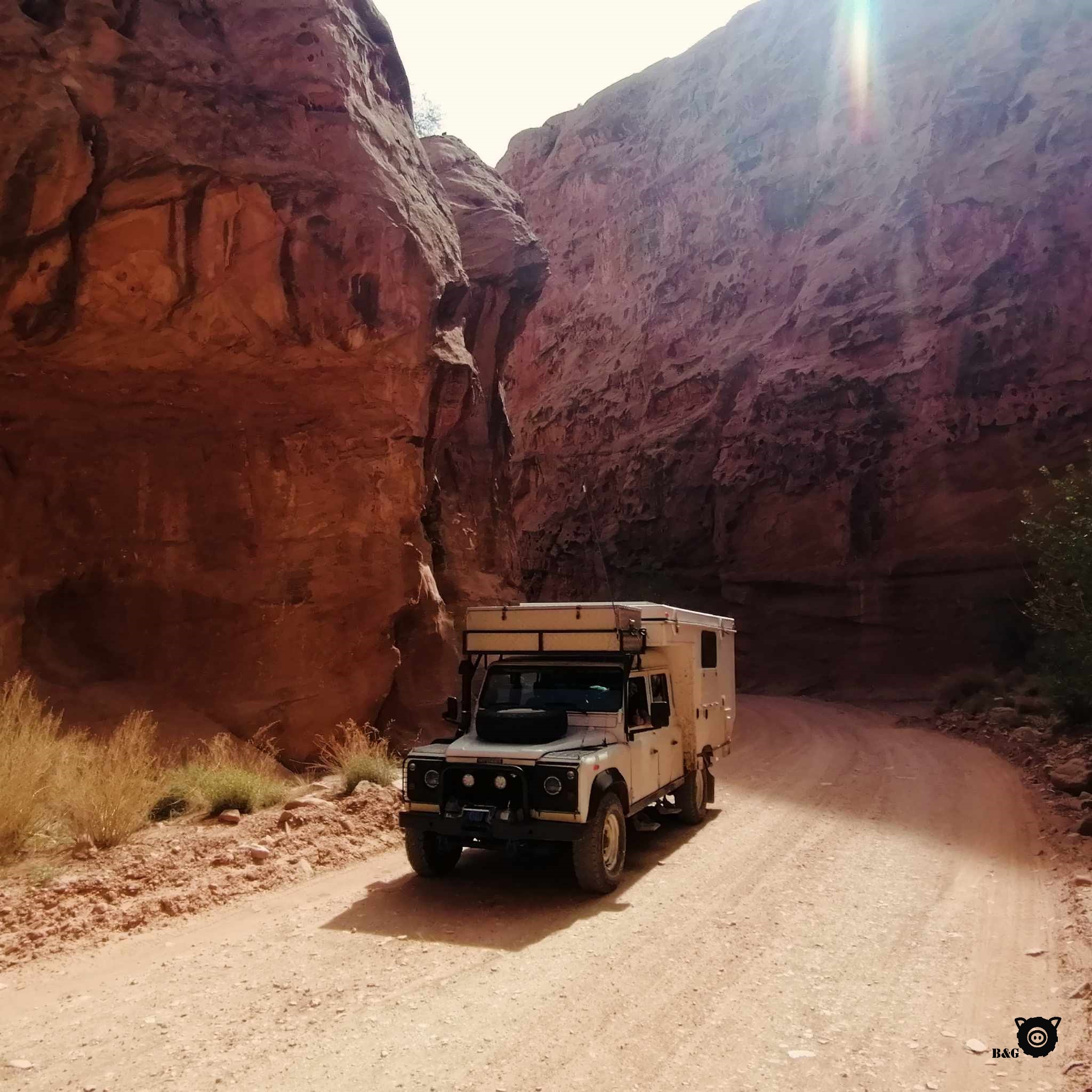 Et pour poursuivre nos parcs en série, nous nous arrêtons en troisième lieu dans le parc national de Capitol Reef. Il n’était pas nécessairement prévu, mais tant qu’à passer par là…! Il est un peu moins célèbre, ce qui nous permet de s’y promener un peu plus librement, même si on constate rapidement sa popularité. Je peux même m’y amuser à faire un peu de hors route dans les canyons rouges de l’Utah, comme mes humains d’ailleurs, qui poursuivent avec les yeux grands leur découverte de cet état surprenant.