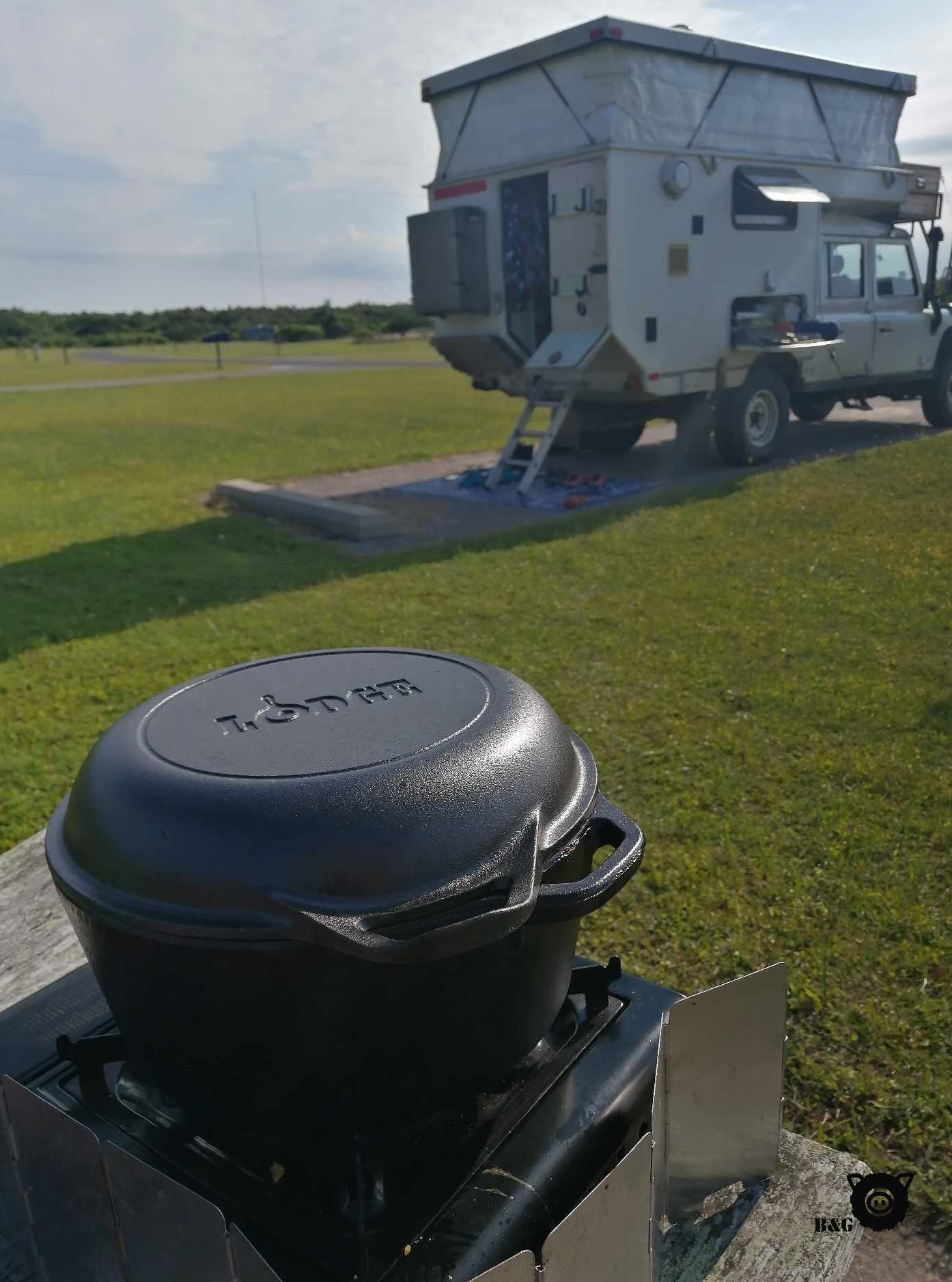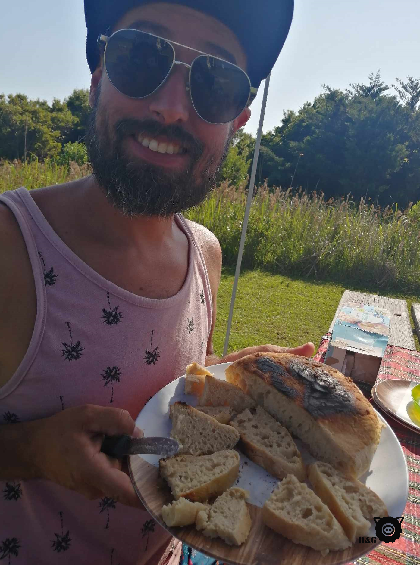 Ah oui… et quand on s’arrête au camping, on prend davantage le temps de cuisiner! Dans ce cas-ci: guédilles aux écrevisses de la Louisiane, et pain maison dans le nouveau dutch oven de Papa!