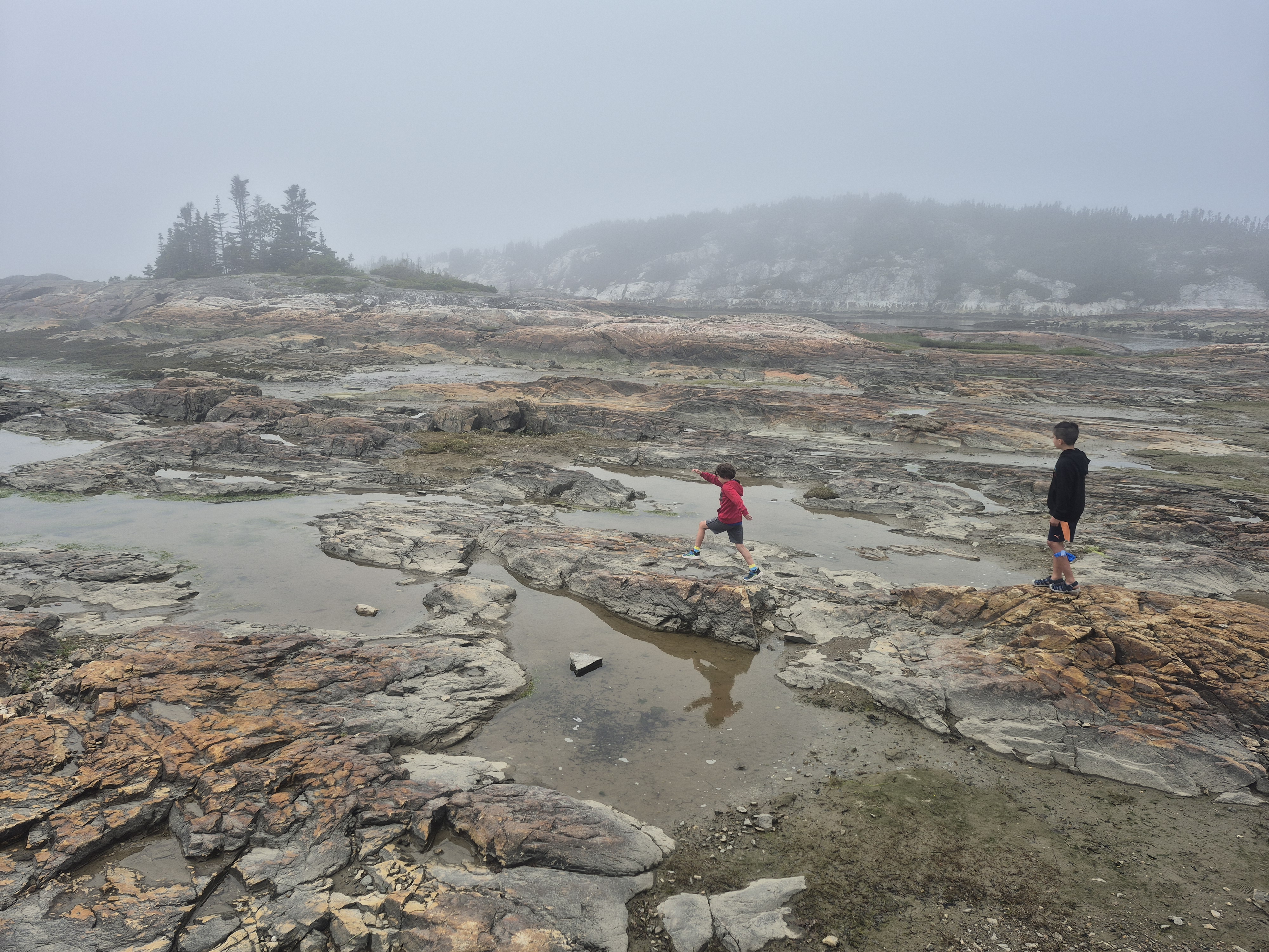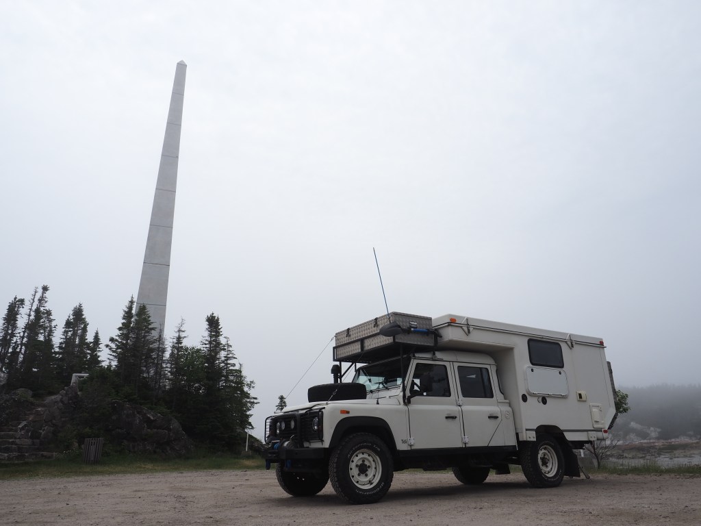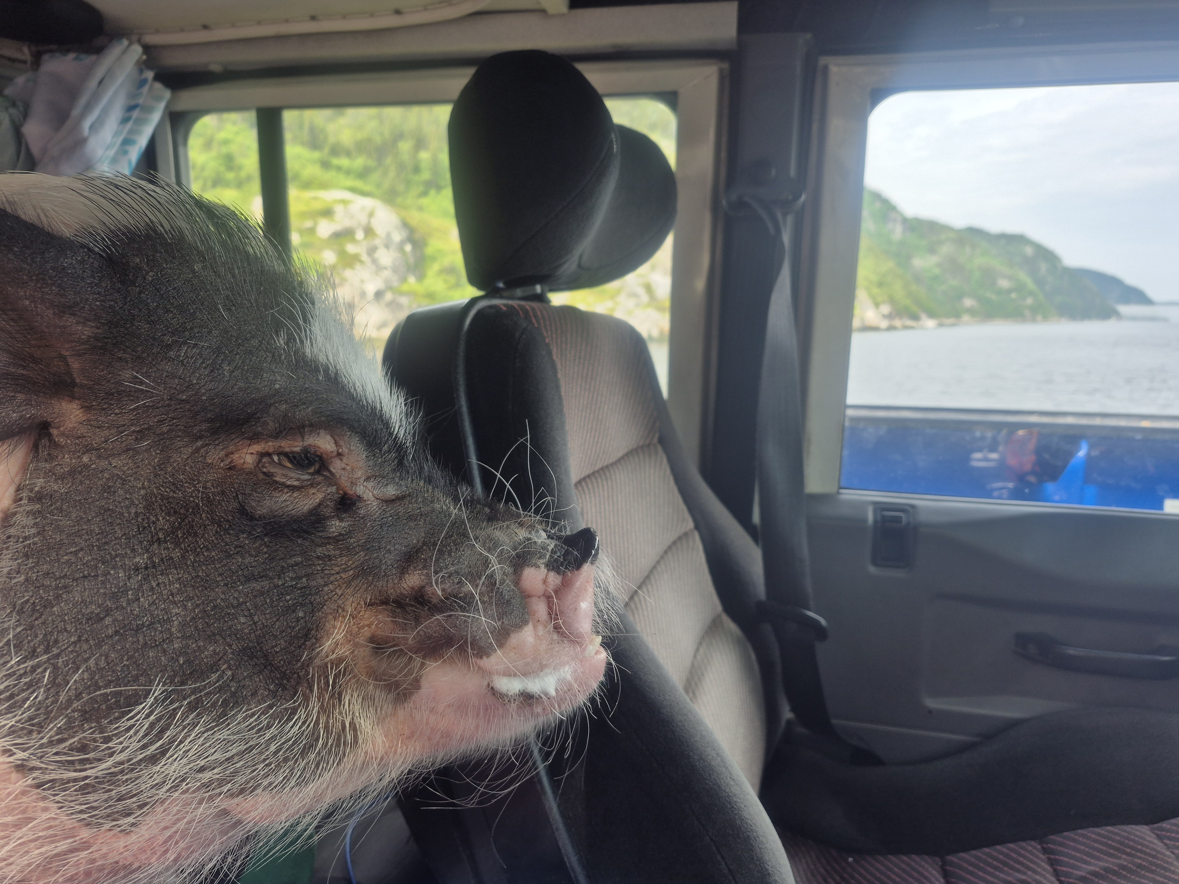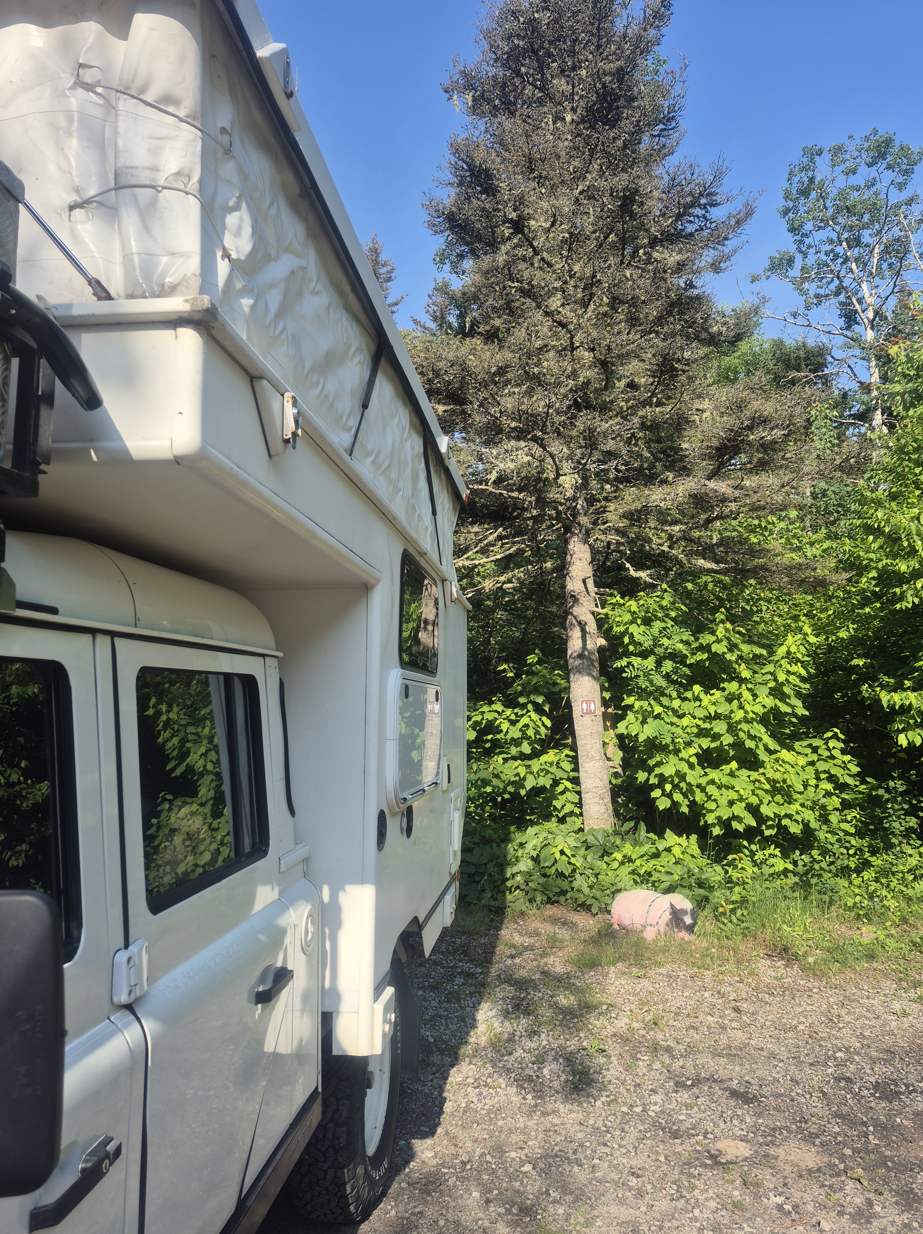 On se réveille ce matin à la lumière des rayons de soleil qui viennent doucement réchauffer Babar. J’en profite pour me prélasser un peu dehors pendant que mes humains déjeunent et se préparent à lever le camp. Après que Babar ait jeté un dernier coup d’oeil à la brume matinale qui se levait sur le quai, il s’est remis en route pour poursuivre son chemin vers Baie-Comeau. Après le joli tour de traversier à Tadoussac (où nous passons de justesse avant la foule qui commence!), nous arrêtons diner et dégourdir les pattes des garçons au Quai de Ragueneau (célèbre pour ses étranges dinosaures grandeur nature!). Et nous y trouvons par hasard la magnifique surprise de visages connus, qui sont eux aussi venus profiter des merveilles que la Côte-Nord a à offrir! Après quelques récits de voyage et échanges de bons trucs, on se dit au revoir et chacun reprend sa route le sourire aux lèvres de cette belle rencontre inattendue. Viennent ensuite les retrouvailles avec nos amies de longue date, ainsi que de belles nouvelles rencontres qui nous font passer à tous une soirée très agréable au bord de la Manicouagan. Pour les intéressés, je vous confirme d’ailleurs que le trèfle nord-côtier a un petit quelque chose de marin qui lui donne définitivement un goût de revenez-y. En bref, je me suis régalé! En tout cas définitivement autant que mes humains avec leur pizza aux fruits de mer et leur homard de la région…