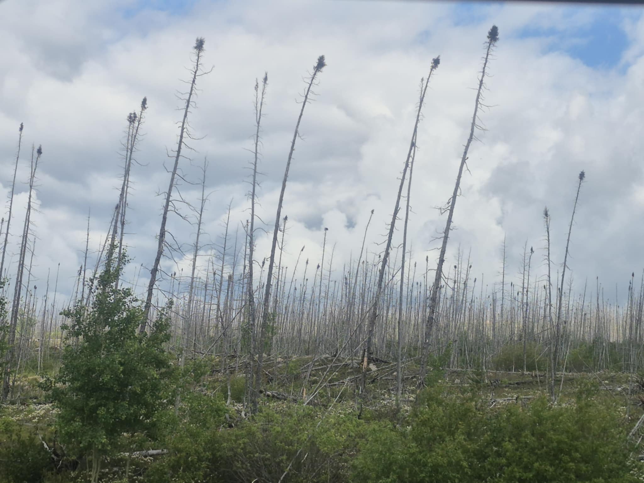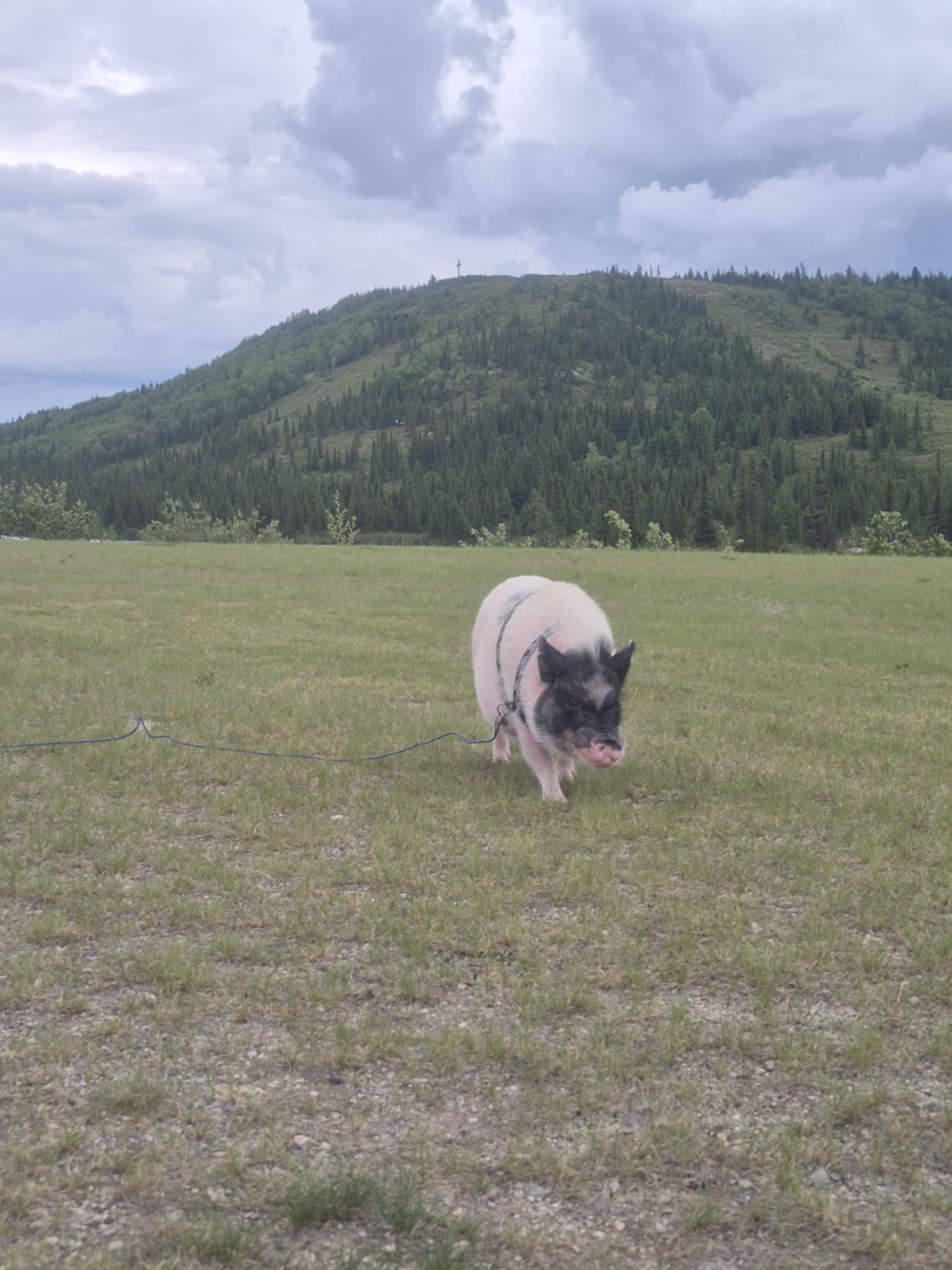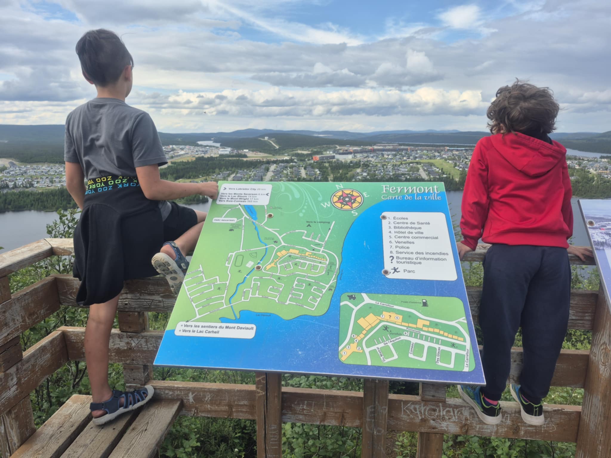 Mais une fois cette mésaventure de mouches noires terminée (pour le moment), les kilomètres recommencent à défiler en alternant entre la belle asphalte neuve, certains tronçons un peu plus usés et carrément la route de terre. Papa pratique sa conduite sportive de clutch-déclutch (même pas besoin de faire du hors route!) et le paysage défile au rythme des épinettes noires, certaines toutes dénudées en raison de feux de forêt passés, et des camions que nous croisons. Nous arrivons finalement, plusieurs heures plus tard, à Fermont, dernière ville avant le Labrador! Nous y sommes accueillis par les immenses mines à ciel ouvert d’Arcelor Mittal. C’est gigantesque! Et juste après, on se fait tout bien organiser par les sympathiques employées du bureau d’info touristique (les garçons ne manquent pas de récupérer leurs autocollants!) pour passer notre après-midi ici. J’attends sagement (je suis toujours sage quand j’ai l’occasion de faire la sieste) pendant que mes humains randonnent allègrement sur le Mont Daviault et admirent la vue de cette étrange ville qu’est Fermont. Avec son mur-écran qui rassemble la plupart des commerces de la ville et de nombreux logements, elles semble prête à tout, perdue toute seule au bout de sa Côte-Nord. Ça fait vraiment étrange de parcourir ses corridors où on voit apparaitre tantôt une garderie, tantôt une fenêtre donnant sur l’immense piscine intérieure et plus loin une paire de souliers laissés à la porte par les locataires. Il règne une drôle d’ambiance entre les murs d’un beige d’une autre époque de cette bâtisse-ville qui protège les quelques maisons individuelles qui se cachent derrière. On y ressent l’âme communautaire qui l’habite tout en réalisant combien elle est isolée du reste du monde. C’est un endroit bien particulier à visiter, mais très accueillant pour les voyageurs de grand chemin qui osent s’y aventurer. Merci Fermont de nous accueillir pour la nuit!